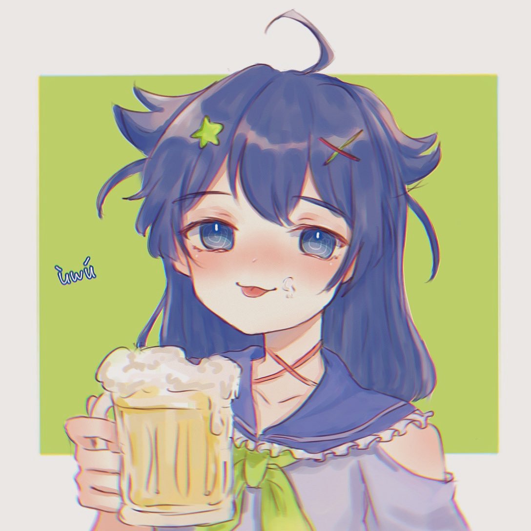 1girl ahoge alcohol beer beer_mug blue_eyes blue_hair cup green_neckerchief grey_shirt hair_flaps hair_ornament happy_(yppah1060) holding holding_cup indie_virtual_youtuber long_hair looking_at_viewer mug neckerchief senzawa shirt solo star_(symbol) star_hair_ornament tongue tongue_out virtual_youtuber x_hair_ornament