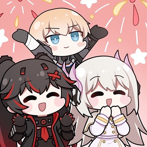 1boy 2girls black_hair blonde_hair blue_eyes blush_stickers chibi closed_eyes euyueuy fireworks gloves gradient_hair hand_to_own_mouth hands_up lee:_hyperreal_(pgr) lee_(pgr) liv:_eclipse_(pgr) liv_(pgr) lowres lucia:_plume_(pgr) lucia_(pgr) multicolored_hair multiple_girls official_art punishing:_gray_raven red_hair sticker_(medium) twintails white_hair