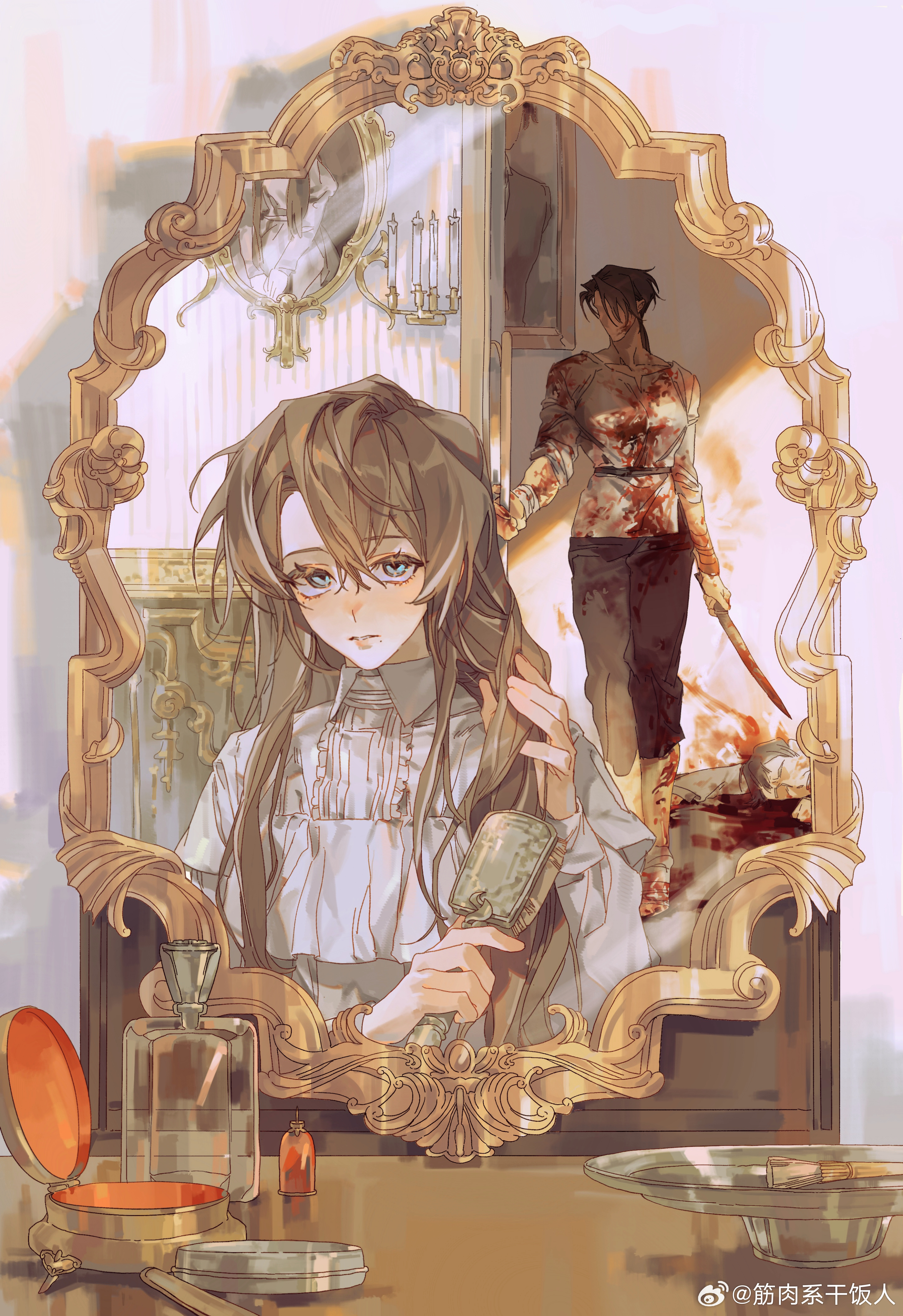 2girls absurdres bandaged_arm bandages blood blood_on_clothes blood_on_face bloody_weapon blue_eyes brown_hair brushing_hair candlestand commentary_request door hair_brush highres holding holding_hair_brush holding_sword holding_weapon mirror multiple_girls muscle_foodie original portrait_(object) reflection shirt sword table vanity_table watermark weapon weibo_username weibo_watermark white_shirt