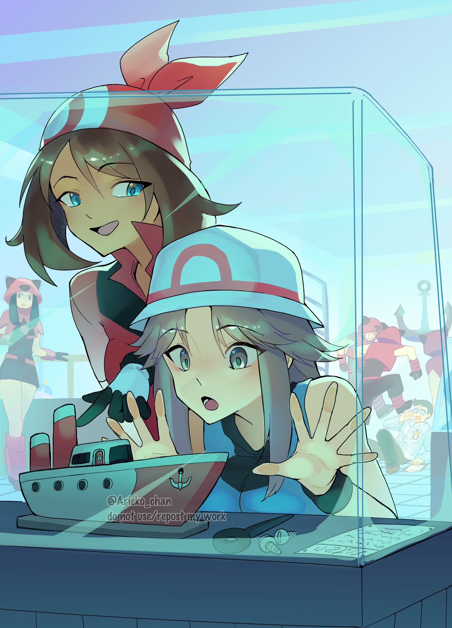 ariekochan bandana baseball_cap black_hair blue_eyes blue_shirt breasts brown_eyes brown_hair fake_horns glasses gloves hat highres hood hood_up horns lab_coat leaf_(pokemon) long_hair may_(pokemon) multiple_boys multiple_girls nintendo open_mouth pokemon pokemon_firered_and_leafgreen pokemon_ruby/sapphire/emerald red_bandana red_shirt scientist_(pokemon) shirt short_hair sleeveless sleeveless_shirt smile team_magma team_magma_grunt team_magma_grunt_(female) team_magma_uniform white_hat wristband