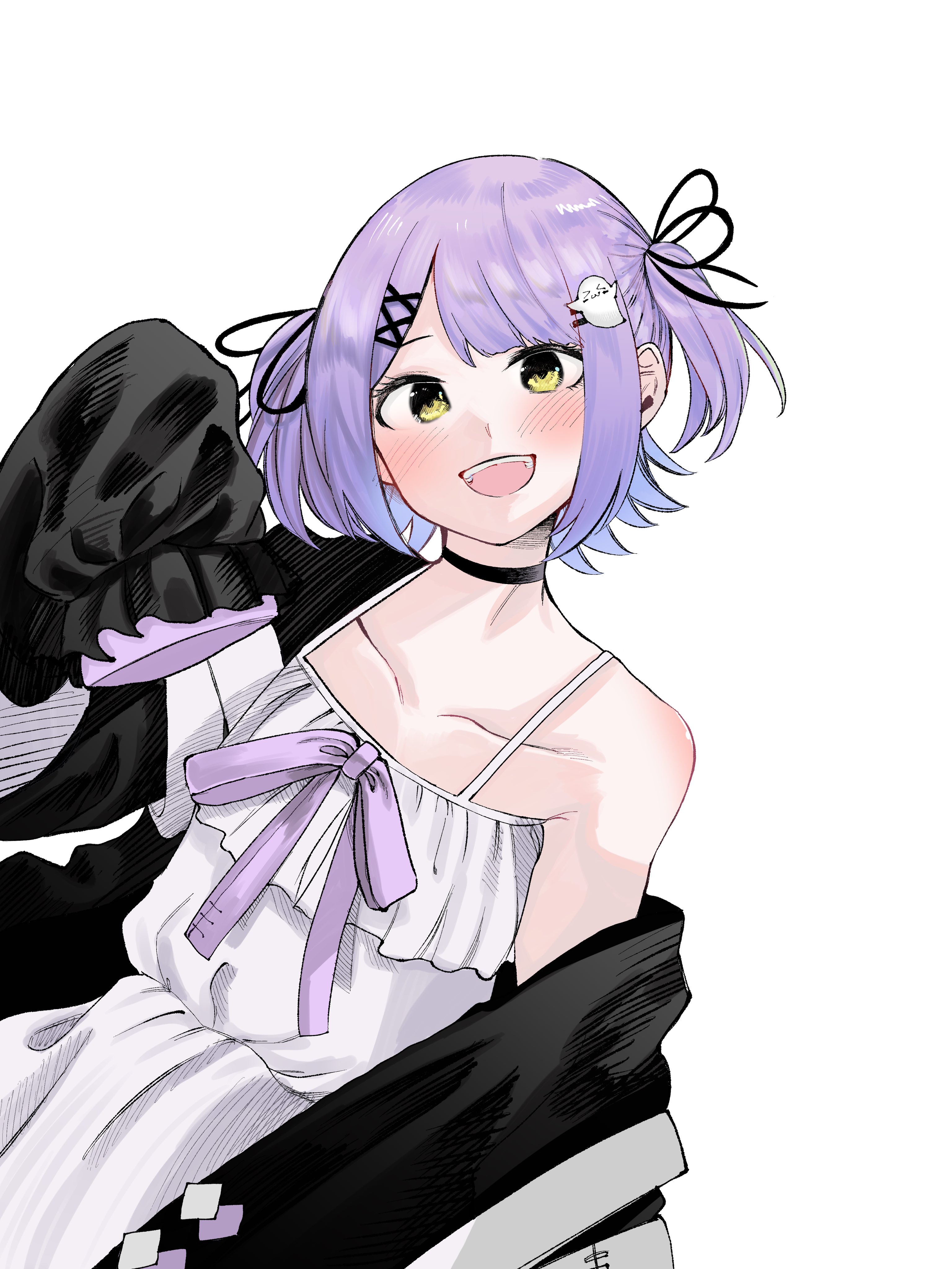 1girl absurdres black_choker black_jacket black_ribbon blush chemise choker collarbone colored_inner_hair hair_ornament hair_ribbon hairpin highres jacket kou_hei_(takasr_kou) long_sleeves multicolored_hair open_mouth parted_bangs purple_hair purple_ribbon ribbon shinomiya_runa shinomiya_runa_(1st_costume) simple_background single_bare_shoulder single_off_shoulder sleeves_past_fingers sleeves_past_wrists solo spaghetti_strap teeth two_side_up upper_body upper_teeth_only virtual_youtuber vspo! white_background white_chemise x_hair_ornament yellow_eyes