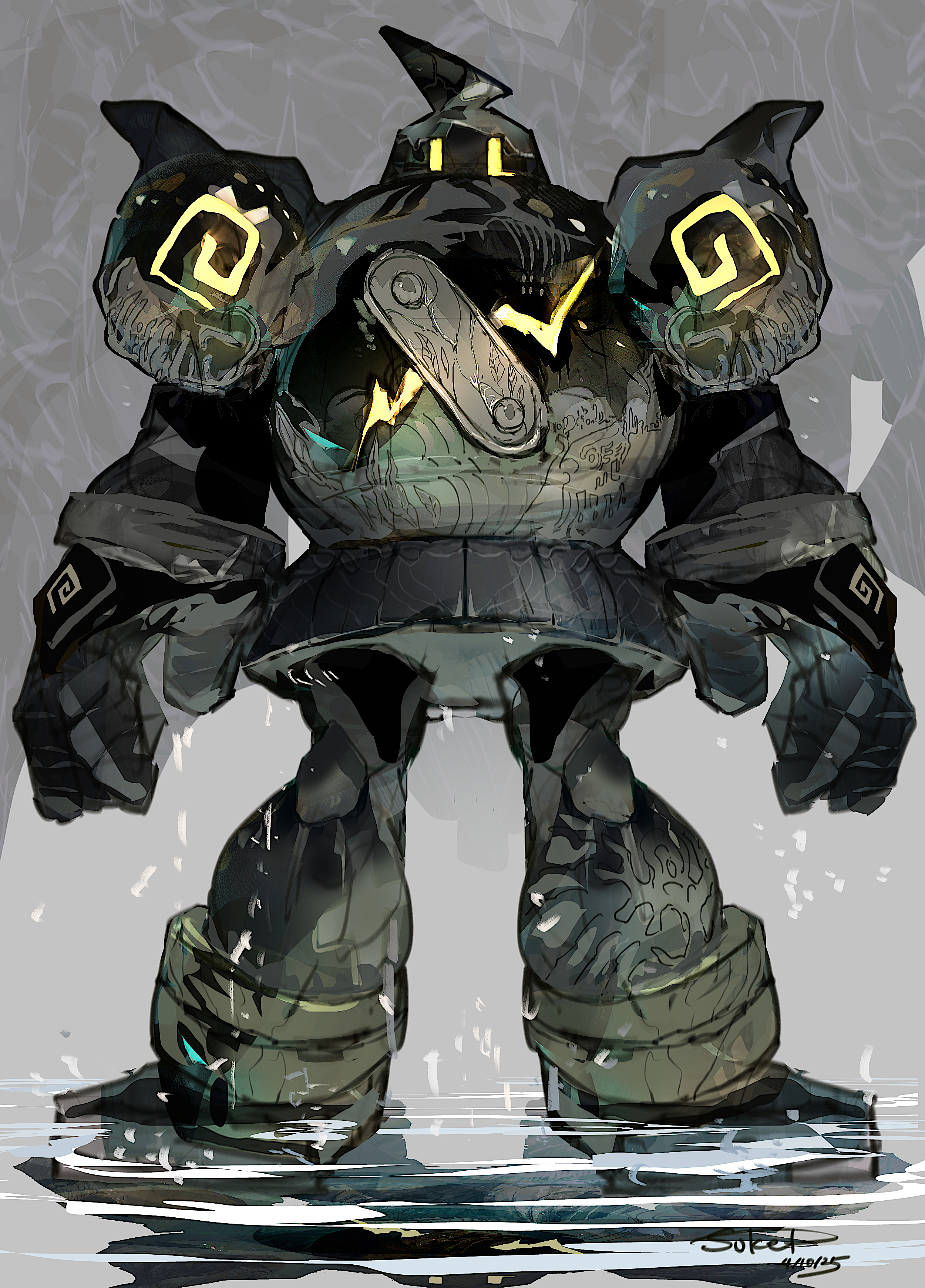 1other absurdres commentary_request gen_5_pokemon glowing golem golurk highres nintendo other_focus pokemon pokemon_(creature) puddle reflection standing standing_on_liquid sukepmonster water yellow_eyes