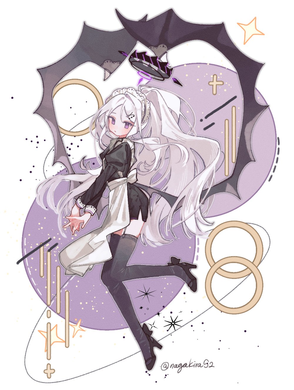1girl alternate_costume apron black_dress black_shoes black_thighhighs black_wings blue_archive closed_mouth commentary_request dress full_body garter_straps hair_ornament hairclip halo high_heels highres hina_(blue_archive) juliet_sleeves korean_commentary long_hair long_sleeves low_wings maid_headdress nagakiras2 ponytail puffy_sleeves purple_eyes shoes side_slit solo sparkle thighhighs twitter_username very_long_hair waist_apron white_apron white_hair wings