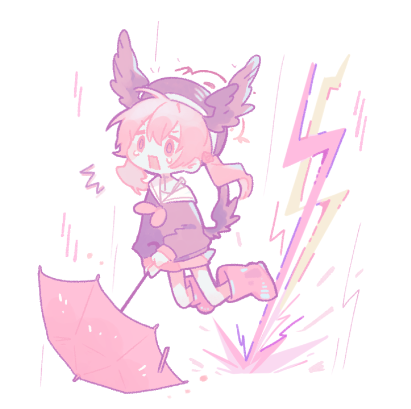 1girl black_hat black_wings blue_archive boots chibi commentary_request hair_between_eyes halo hat head_wings holding holding_umbrella koharu_(blue_archive) korean_commentary lightning long_sleeves mini_wings miniskirt nagakiras2 open_mouth pink_eyes pink_hair rain rubber_boots sailor_collar school_uniform serafuku skirt solo standing tears twintails umbrella wings