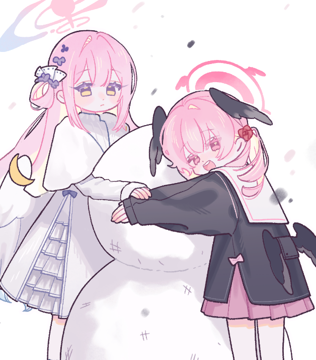 2girls black_wings blue_archive blush closed_mouth commentary_request dress flower hair_between_eyes hair_flower hair_ornament halo head_wings koharu_(blue_archive) korean_commentary long_hair long_sleeves looking_at_viewer mika_(blue_archive) multiple_girls nagakiras2 open_mouth pink_eyes pink_hair sailor_collar simple_background sleeves_past_wrists snowman teeth upper_teeth_only very_long_hair white_background white_dress white_sailor_collar white_wings wings yellow_eyes