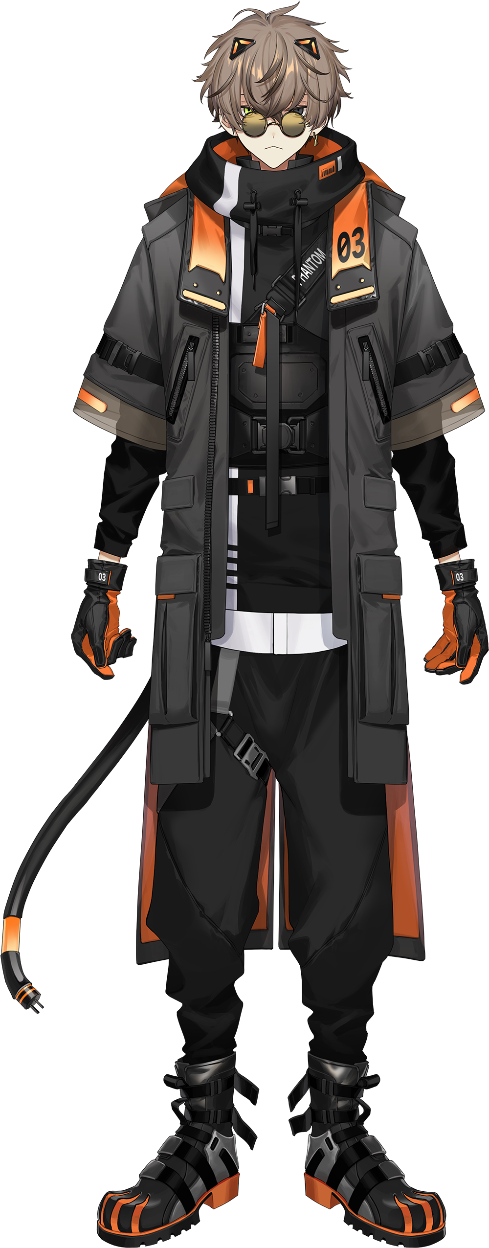 1boy :< absurdres alban_knox alban_knox_(1st_costume) antenna_hair black_boots black_gloves black_hoodie black_pants boots brown-tinted_eyewear brown_hair closed_mouth coat crossed_bangs drawstring earrings electric_plug electric_plug_tail glasses gloves green_eyes grey_coat grey_eyes hair_between_eyes heterochromia highres hood hood_down hoodie itefu jewelry layered_sleeves long_sleeves looking_at_viewer male_focus multicolored_boots nijisanji nijisanji_en official_alternate_costume official_art open_clothes open_coat orange_boots orange_gloves pants round_eyewear short_hair short_over_long_sleeves short_sleeves single_earring solo tail tinted_eyewear transparent_background two-tone_boots two-tone_gloves virtual_youtuber zipper zipper_pull_tab