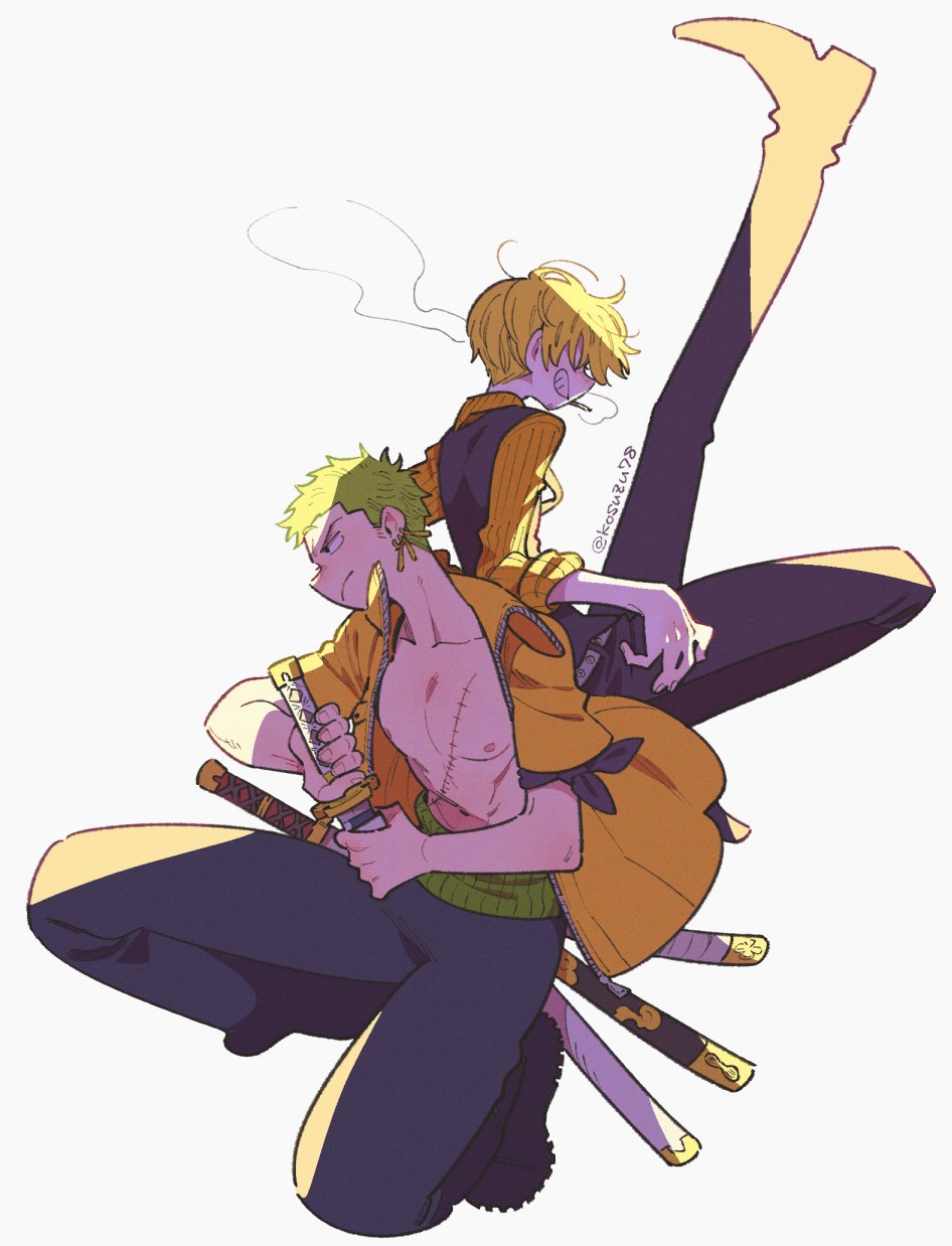 2boys black_vest blonde_hair cigarette commentary_request earrings full_body green_hair haramaki highres jewelry leg_up male_focus mitsubachi_koucha multiple_boys one_piece open_clothes open_shirt orange_shirt profile roronoa_zoro sanji_(one_piece) shirt short_hair simple_background smoke stitched_torso stitches striped_clothes striped_shirt twitter_username vertical-striped_clothes vertical-striped_shirt vest white_background yellow_shirt