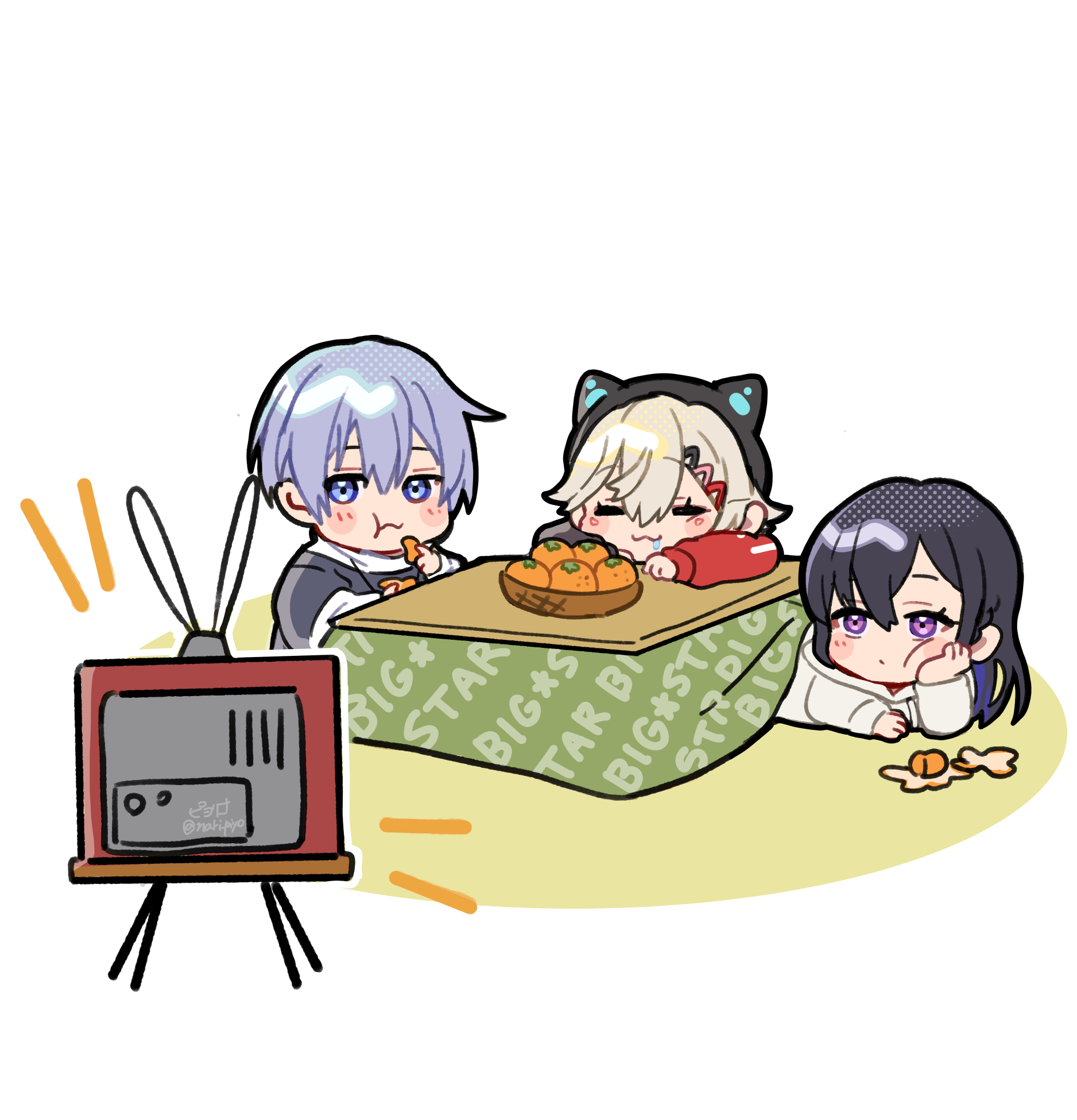1boy 2girls animal_hat artist_name black_hair black_hat blonde_hair blue_eyes blue_hair blush cat_hat closed_eyes closed_mouth commentary_request deformed drooling eating food fruit hat head_rest highres ichinose_uruha komori_met kotatsu mandarin_orange multiple_girls neo-porte notice_lines piyoyanagi purple_eyes shirayuki_reid sleeping table television twitter_username virtual_youtuber vspo! white_background