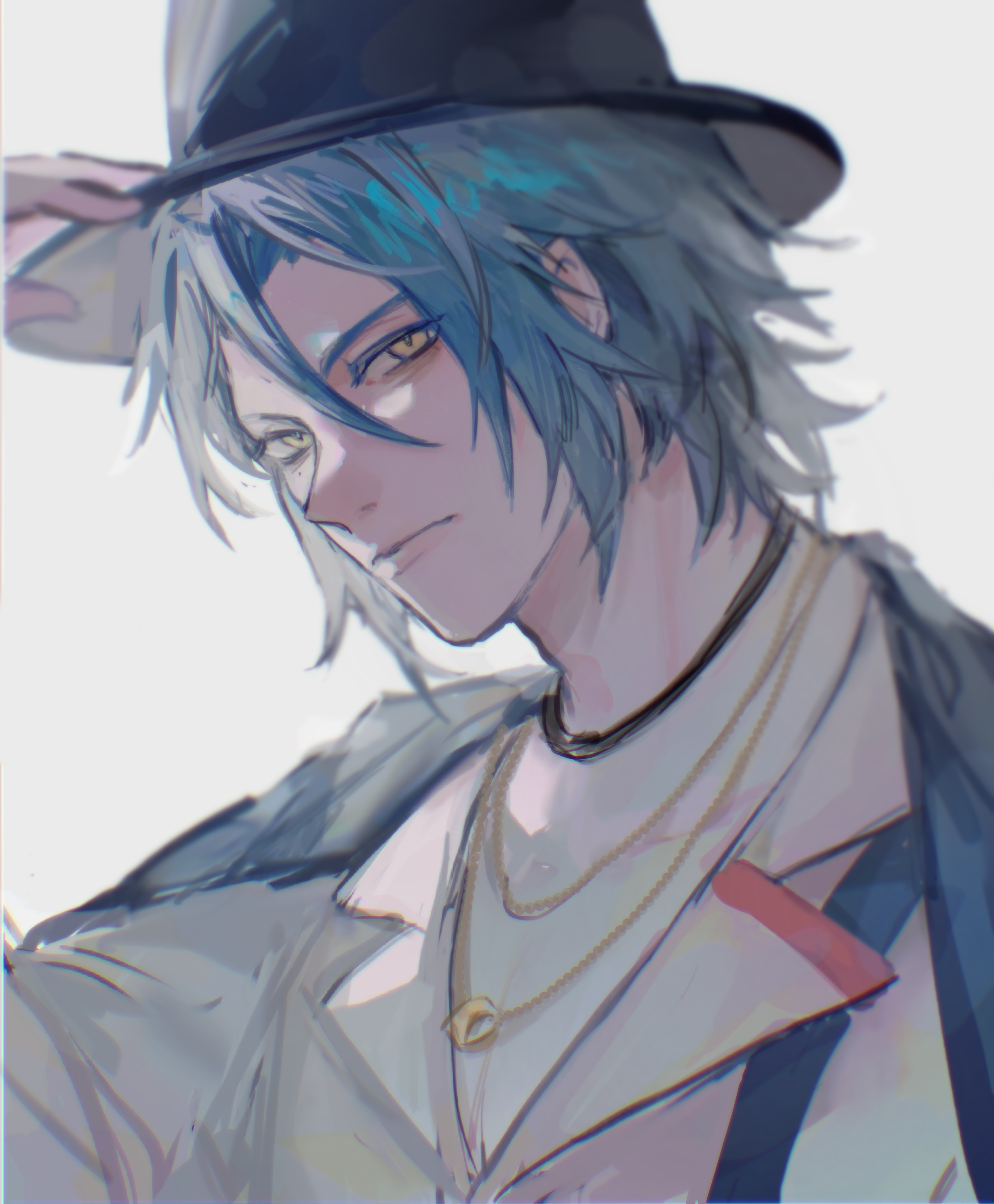 1boy absurdres arm_up black_hat blue_hair closed_mouth curtained_hair ensemble_stars! grey_background grey_jacket hat highres himeru_(ensemble_stars!) jacket jewelry kaochuanyi9060 lapels looking_to_the_side male_focus necklace shirt sideways_glance simple_background solo upper_body white_shirt