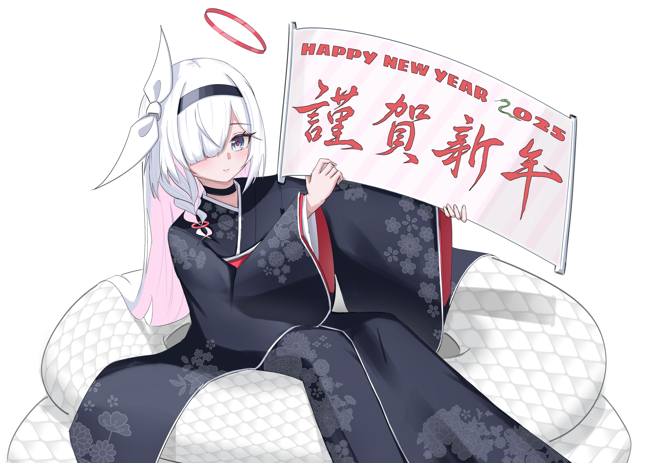 1girl 2025 alternate_costume black_choker black_hairband black_kimono blue_archive blunt_bangs blush bow braid chinese_zodiac choker closed_mouth colored_inner_hair commentary_request dated dere_mono_j eyelashes feet_out_of_frame floral_print floral_print_kimono furisode grey_eyes hair_bow hair_over_one_eye hair_spread_out hairband halo hands_up happy_new_year highres holding holding_sign japanese_clothes kimono long_bangs long_hair long_sleeves looking_at_viewer multicolored_hair new_year one_eye_covered pink_hair plana_(blue_archive) print_kimono red_halo red_pupils sign simple_background single_braid sitting smile snake solo straight_hair very_long_hair white_background white_bow white_hair white_snake wide_sleeves year_of_the_snake