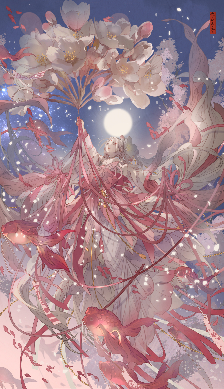 1girl cherry_blossoms eyeshadow fish full_body full_moon highres holding japanese_clothes kimono looking_up makeup moon nanahara_shie night original pink_theme red_eyeshadow sky smile white_hair