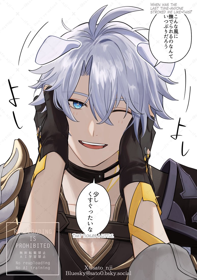2boys animal_ears antenna_hair armor bilingual_text black_choker black_gloves black_shirt blue_eyes bluesky_username caelus_(honkai:_star_rail) choker collarbone collared_shirt commentary_request dog_ears fingerless_gloves gloves hair_between_eyes hands_on_another's_face honkai:_star_rail honkai_(series) male_focus mixed-language_text multiple_boys one_eye_closed pauldrons phainon_(honkai:_star_rail) sato_nji shirt shoulder_armor simple_background single_pauldron sleeves_rolled_up smile sun_symbol sun_tattoo tan tattoo trailblazer_(honkai:_star_rail) twitter_username watermark white_background white_hair yaoi