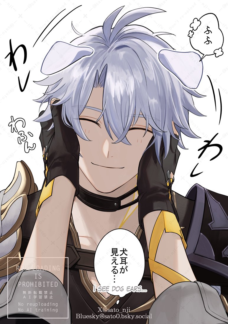 2boys animal_ears antenna_hair armor bilingual_text black_choker black_gloves black_shirt bluesky_username caelus_(honkai:_star_rail) choker closed_eyes collarbone collared_shirt commentary_request dog_ears fingerless_gloves gloves hair_between_eyes hands_on_another's_face honkai:_star_rail honkai_(series) male_focus mixed-language_text multiple_boys pauldrons phainon_(honkai:_star_rail) sato_nji shirt shoulder_armor simple_background single_pauldron sleeves_rolled_up smile sun_symbol sun_tattoo tan tattoo trailblazer_(honkai:_star_rail) twitter_username watermark white_background white_hair yaoi