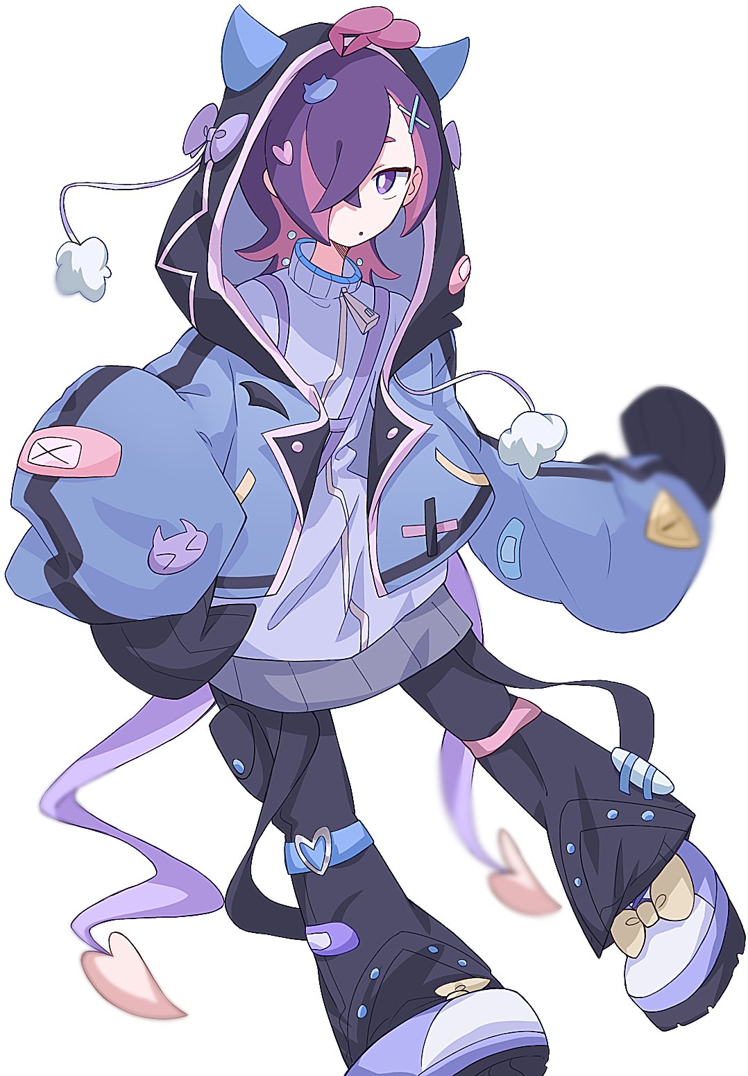 1girl dot_(pokemon) hair_over_one_eye highres hood hooded_jacket hoodie jacket long_hair long_sleeves multicolored_hair multiple_girls nintendo open_clothes open_mouth pants pink_hair pokemon pokemon_(anime) pokemon_horizons purple_eyes purple_hair seiun_(hoshigumo_72) shirt simple_background sleeves_past_wrists white_background