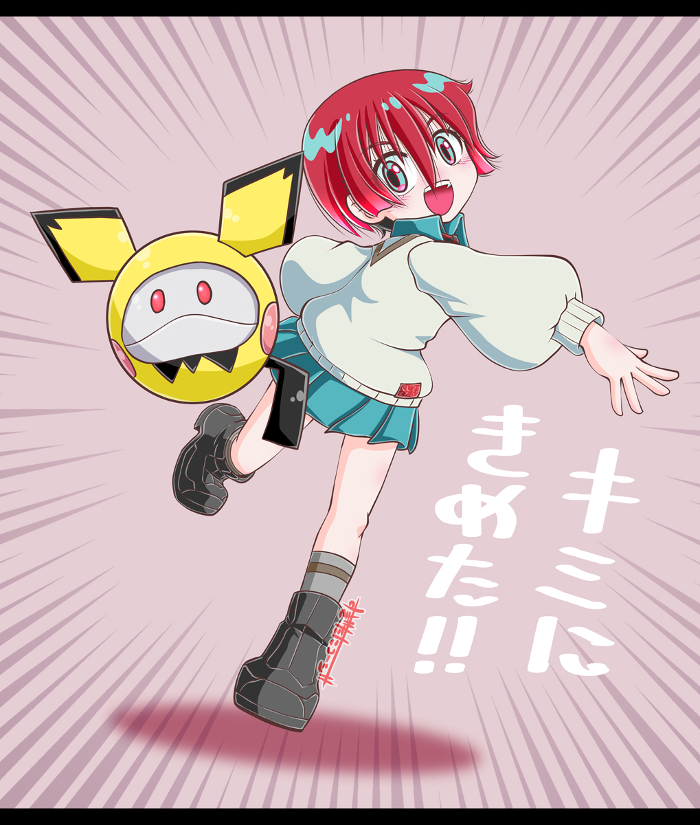 1girl amate_yuzuriha aqua_eyes aqua_shirt aqua_skirt blush collared_shirt cosplay creator_connection gen_2_pokemon gundam gundam_gquuuuuux haro highres holding long_sleeves looking_at_viewer necktie nintendo open_mouth pichu pichu_(cosplay) pokemon red_hair school_uniform shirt short_hair skirt solo sugitani_kouji sweater throwing