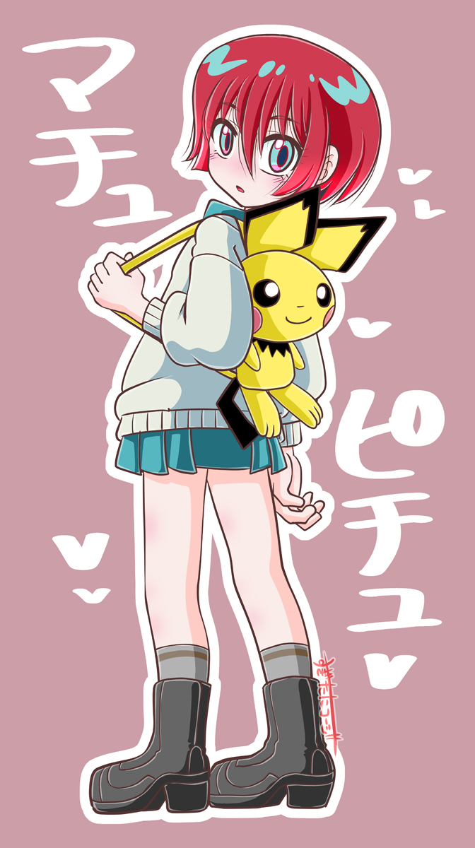 1girl amate_yuzuriha aqua_eyes aqua_shirt aqua_skirt bag blush character_bag collared_shirt creator_connection gen_2_pokemon gundam gundam_gquuuuuux highres holding long_sleeves looking_at_viewer necktie nintendo open_mouth pichu pokemon red_hair school_uniform shirt short_hair shoulder_bag skirt solo sugitani_kouji sweater