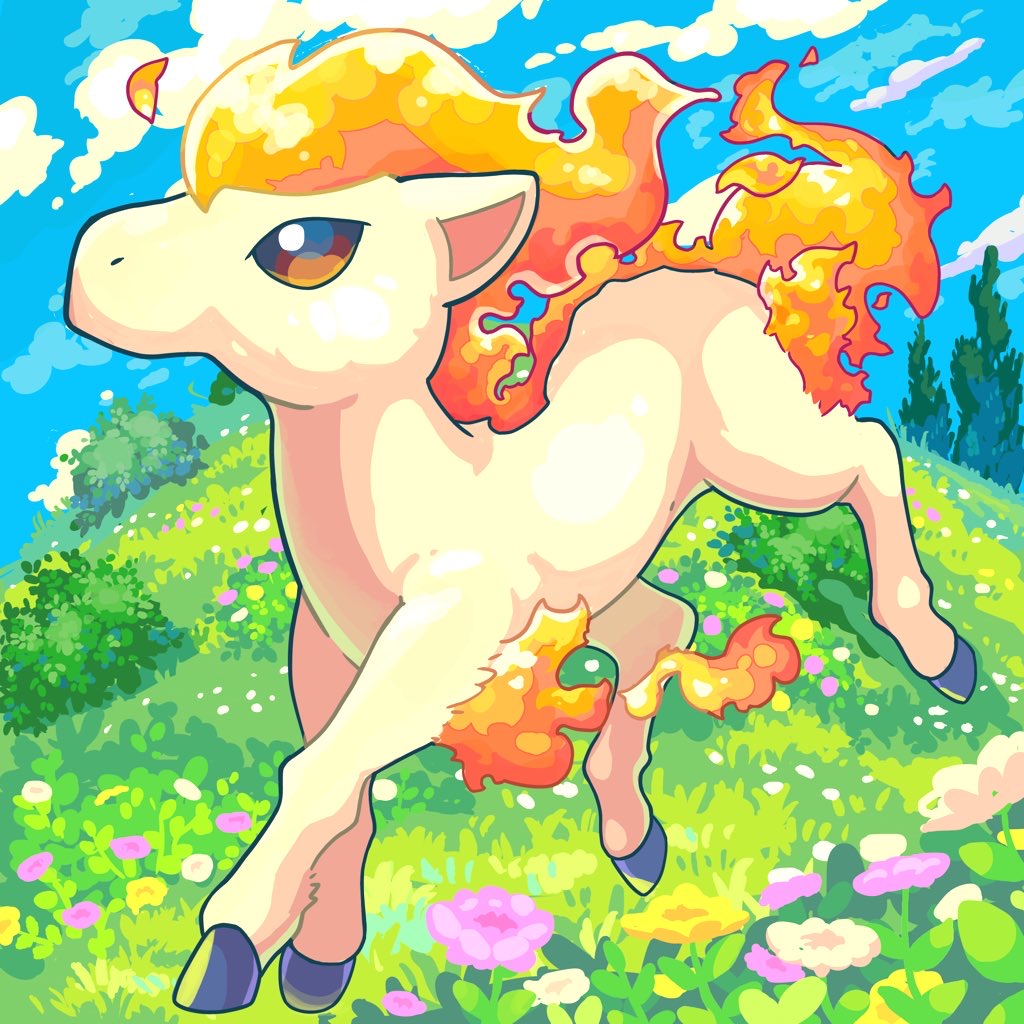 brown_eyes cloud commentary_request day doneko_(dneko0123) fire flower full_body gen_1_pokemon grass looking_up nintendo no_humans outdoors pokemon pokemon_(creature) pokemon_focus ponyta sky