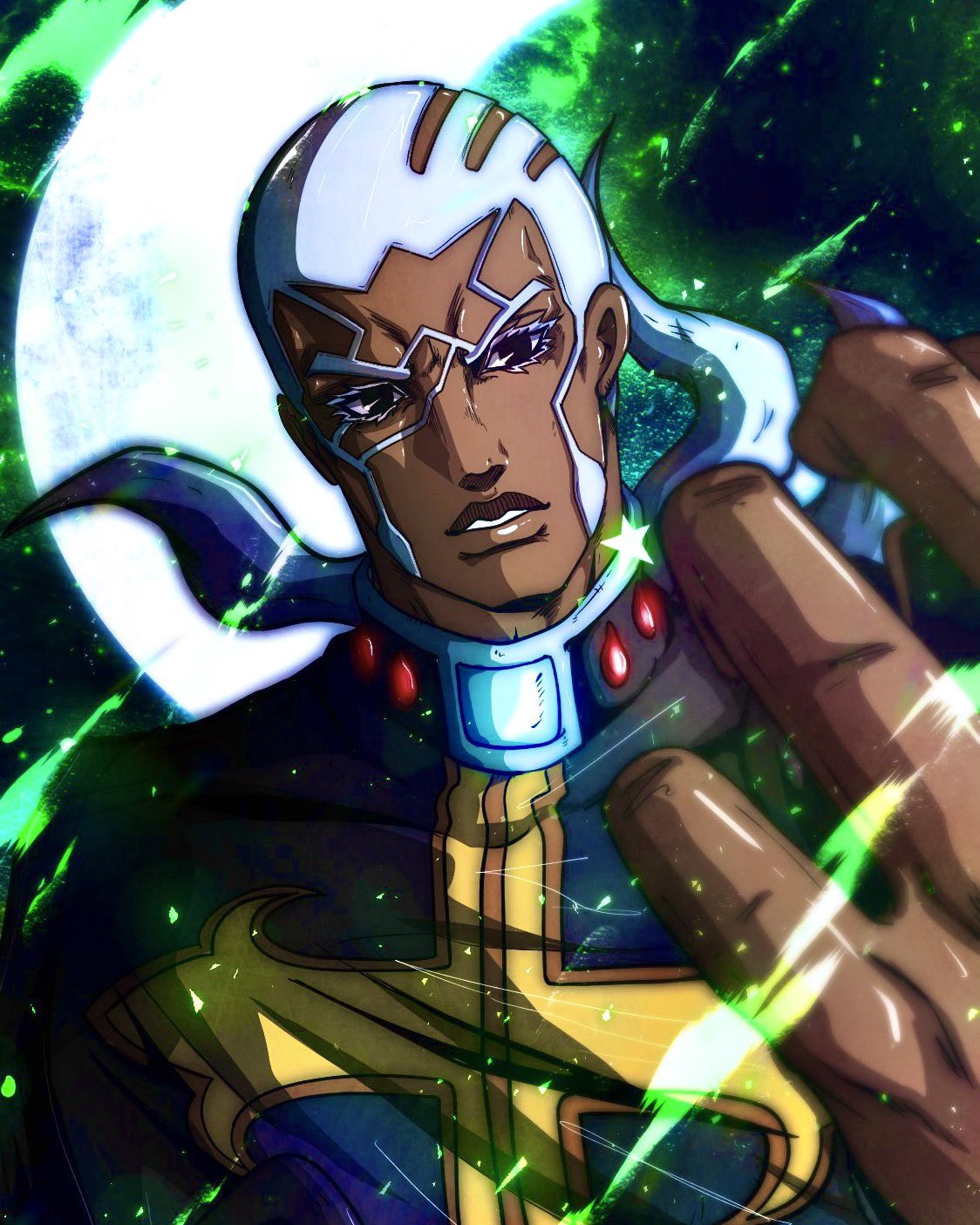 1boy black_eyes cassock colored_eyelashes cross cross_print dark-skinned_male dark_skin enrico_pucci facial_hair high_collar highres jojo_no_kimyou_na_bouken looking_at_viewer male_focus moon noonvincent parted_lips short_hair solo_focus star_(symbol) stone_ocean teeth upper_body very_short_hair white_eyelashes white_hair