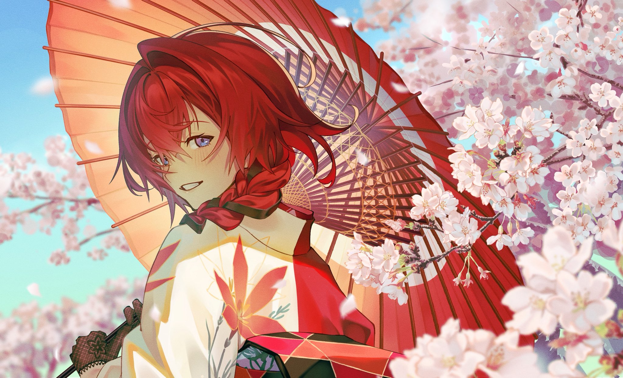 1girl amber589lily ange_katrina ange_katrina_(new_year) black_gloves black_hair blue_eyes blue_sky blurry blush braid cherry_blossoms commentary day depth_of_field falling_petals floral_print floral_print_gloves floral_print_kimono from_behind gloves gradient_eyes grin hair_over_shoulder highres holding holding_umbrella japanese_clothes kimono lace lace_gloves long_bangs long_hair looking_at_viewer looking_back multicolored_eyes multicolored_hair nijisanji oil-paper_umbrella petals pink_petals print_kimono purple_eyes red_hair red_kimono red_umbrella single_hair_intake sky smile solo streaked_hair untranslatable_commentary turning_head two-tone_hair umbrella upper_body virtual_youtuber white_kimono