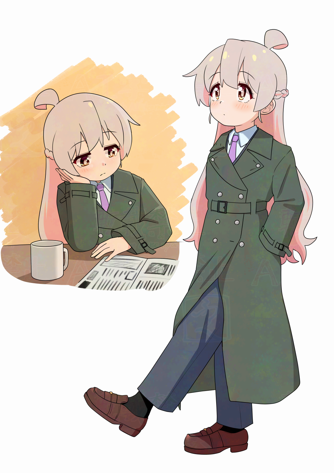 1girl ahoge belt black_pants black_socks braid brown_eyes brown_shoes buttons closed_mouth coat colored_inner_hair commentary cup dot_mouth double-breasted elbow_rest frown grey_hair half_up_braid hand_in_pocket happyundergate head_rest highres light_blush loafers long_hair long_sleeves mug multicolored_hair multiple_views necktie newspaper onii-chan_wa_oshimai! oyama_mahiro pants pink_hair pink_necktie shirt shoes simple_background socks trench_coat two-tone_hair very_long_hair white_background white_shirt wing_collar