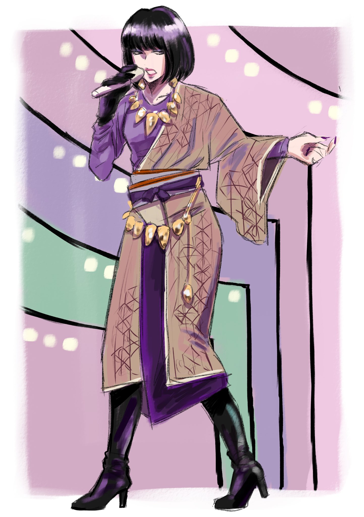 1girl 96_hs60sk black_boots black_hair black_nails blunt_bangs bob_cut boots commentary_request full_body high_heel_boots high_heels highres holding holding_microphone japanese_clothes kimono long_sleeves looking_to_the_side microphone nakamori_akina pink_lips real_life sash solo wide_sleeves