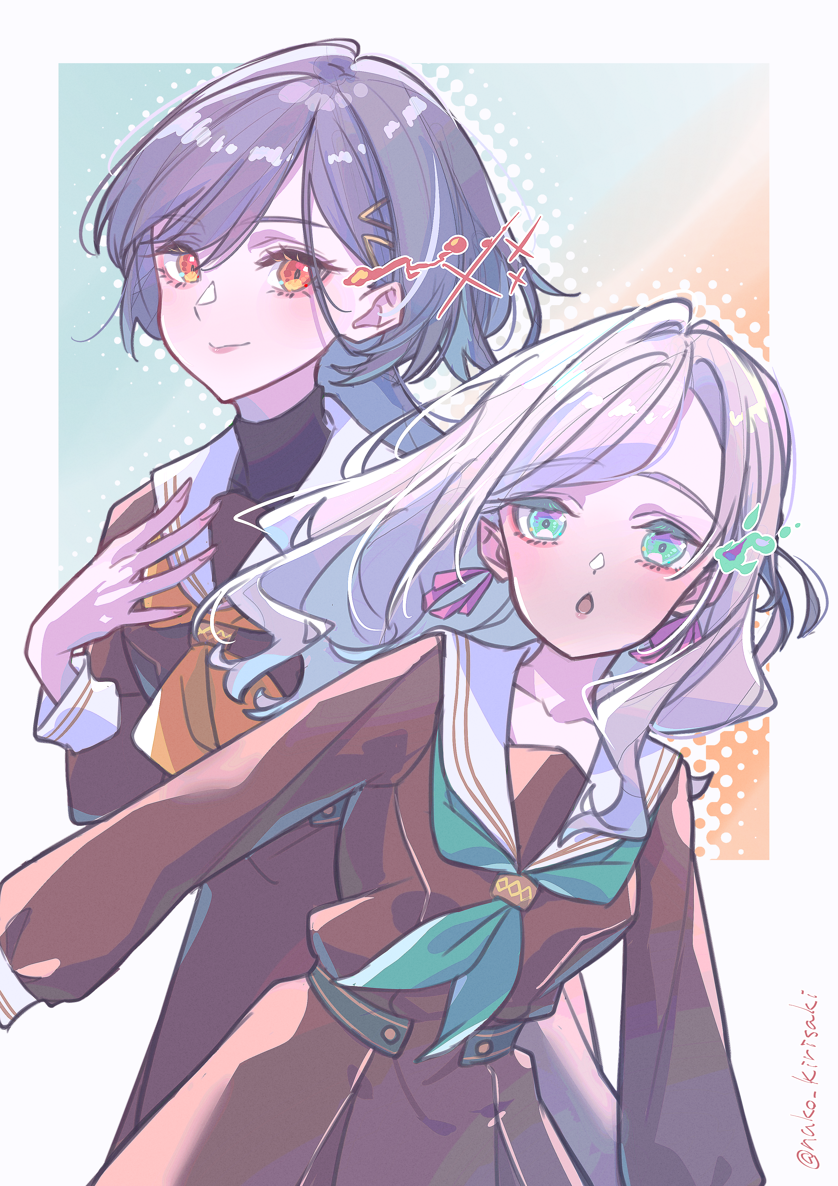 2girls absurdres aqua_neckerchief blue_background blue_eyes border brown_dress ceras_yanagida_lilienfeld commentary_request dress edel_note gradient_background grey_hair hair_ornament hair_ribbon hasu_no_sora_school_uniform highres katsuragi_izumi kirisaki_nuko link!_like!_love_live! long_hair long_sleeves love_live! multiple_girls neckerchief orange_background orange_eyes outside_border pink_ribbon ribbon sailor_collar sailor_dress school_uniform swept_bangs triangle_hair_ornament virtual_youtuber white_border white_sailor_collar winter_uniform wolf_cut yellow_neckerchief