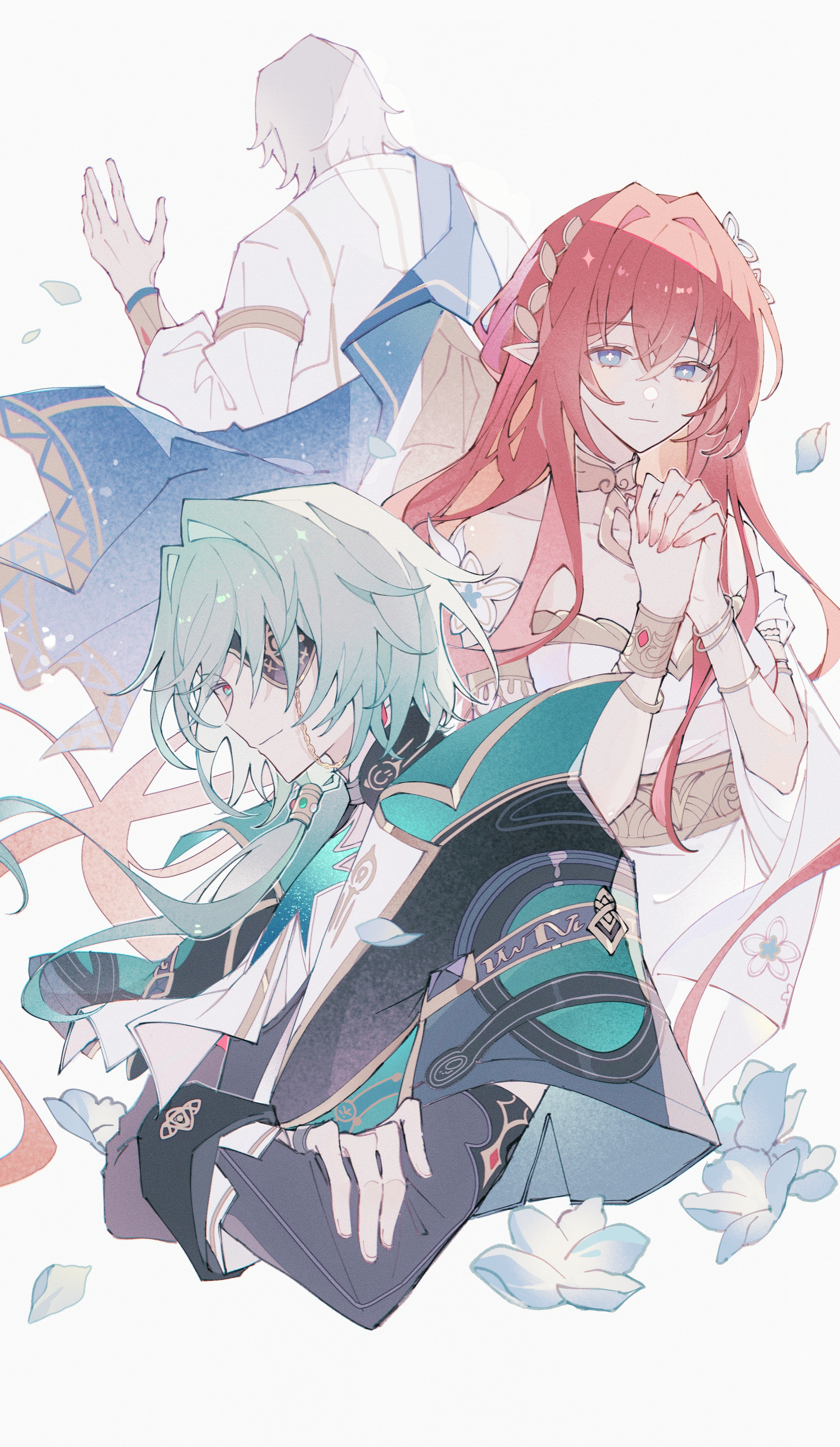 1girl 2boys absurdres anaxa_(honkai:_star_rail) black_coat blue_eyes character_request chinese_commentary coat commentary_request cross-shaped_pupils dress eyepatch green_hair highres honkai:_star_rail honkai_(series) laurel_crown long_hair multiple_boys own_hands_together pointy_ears red_hair shirt simple_background symbol-shaped_pupils tribios_(honkai:_star_rail) white_background white_dress white_shirt yue_(shemika98425261)