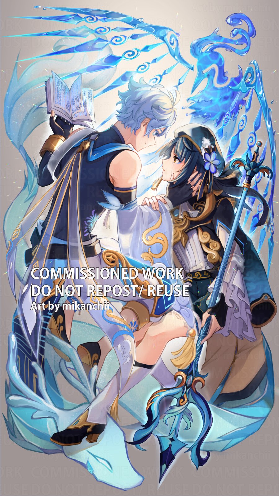 2boys ahoge alternate_costume artist_name ascot asymmetrical_hair belt beret bird black_belt black_gloves black_shirt black_shoes blue_coat blue_eyes blue_eyeshadow blue_flower blue_hair blue_hat blue_ribbon blue_shorts book bracelet cape center_frills chongyun_(genshin_impact) closed_mouth coat coat_on_shoulders commentary commission crane_(animal) detached_sleeves dragon earrings eastern_dragon elbow_gloves english_commentary eye_contact eyeshadow fingerless_gloves flower frilled_sleeves frills genshin_impact gloves gold_trim grey_background hand_on_another's_cheek hand_on_another's_face hand_up hands_up hat hat_flower hat_ribbon high_heels highres holding holding_book holding_polearm holding_weapon ice jewelry lace_trim long_sleeves looking_at_another makeup male_focus mikanchii mole mole_under_eye multiple_boys open_book pants parted_bangs polearm profile ribbon see-through_cape shirt shoes short_hair short_shorts shorts single_earring sleeveless sleeveless_shirt socks sparkle spear tassel tassel_earrings tears water watermark weapon white_pants white_shirt white_socks wide_sleeves xingqiu_(genshin_impact)