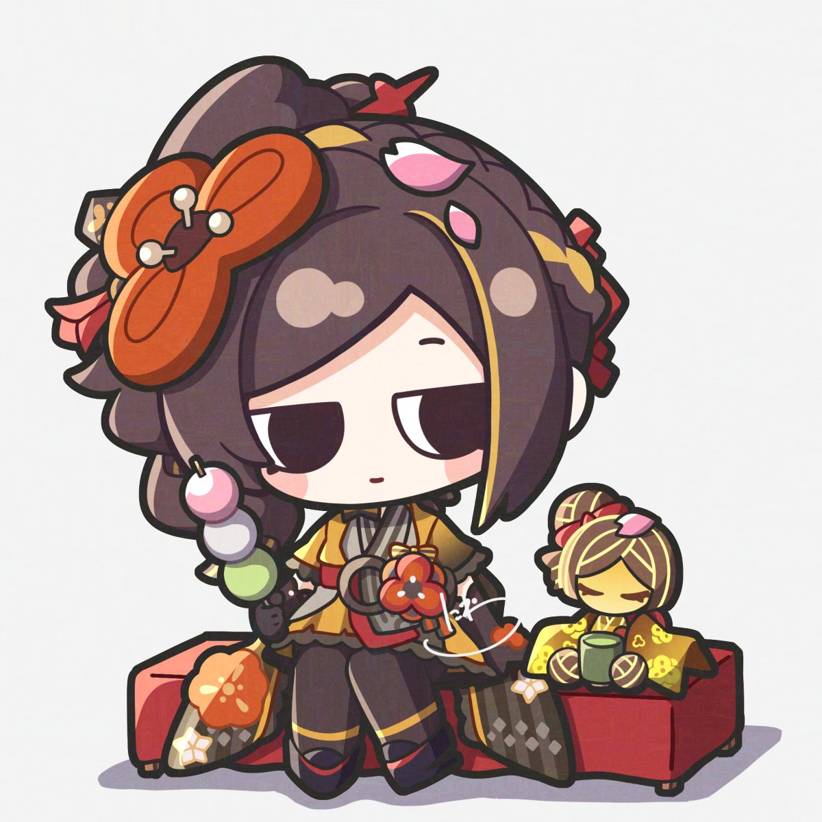 1girl black_gloves black_pantyhose blonde_hair brown_hair chibi chibi_only chiori_(genshin_impact) commentary_request cup dango doll food full_body genshin_impact gloves grey_kimono hair_ornament highres holding holding_food jacket japanese_clothes kimono multicolored_hair niwa_2810 pantyhose red_sash sanshoku_dango sash signature simple_background sitting solo streaked_hair tamoto_(genshin_impact) wagashi white_background yellow_jacket