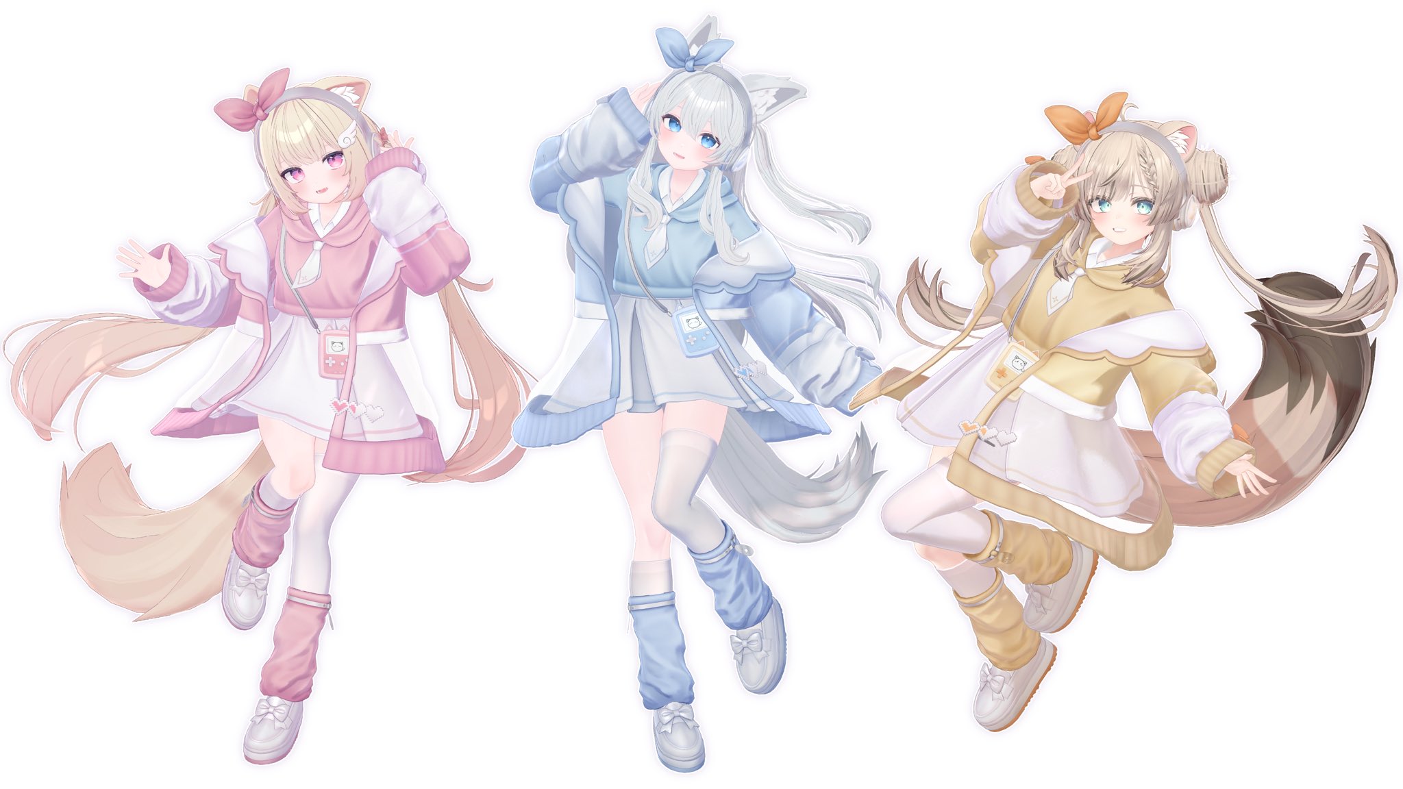 3girls :d animal_ear_fluff animal_ears asymmetrical_legwear blonde_hair blue_eyes blue_jacket blue_shirt blue_socks bow bow_hairband braid brown_hair chiffon_(vrchat) collared_shirt double_bun fox_ears fox_girl fox_tail full_body green_eyes grey_hair grey_skirt hair_bow hair_bun hair_ribbon hairband highres hom_peg hood hoodie id_card jacket kneehighs leg_warmers lime_(vrchat) long_hair long_sleeves looking_at_viewer loose_socks low_twintails manuka_(vrchat) mismatched_legwear multiple_girls neckerchief necktie open_clothes open_jacket open_mouth pink_bow pink_eyes pink_jacket pink_shirt pink_sweater puffy_long_sleeves puffy_sleeves raccoon_ears raccoon_tail ribbon shirt shoes simple_background single_sock single_thighhigh skirt sleeves_past_wrists smile sneakers socks standing standing_on_one_leg sweater tail thighhighs twintails uneven_legwear v very_long_hair vrchat white_background white_hair white_neckerchief white_necktie white_shirt white_shoes white_skirt white_thighhighs yellow_hoodie yellow_jacket yellow_sweater
