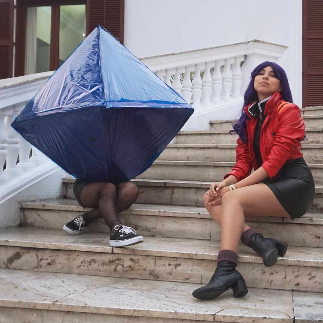 2girls angle cosplay cosplay_photo day jacket katsuragi_misato katsuragi_misato_(cosplay) legs multiple_girls neon_genesis_evangelion pantyhose photo_(medium) purple_hair ramiel_(evangelion) ramiel_(evangelion)_(cosplay) sitting skirt smile