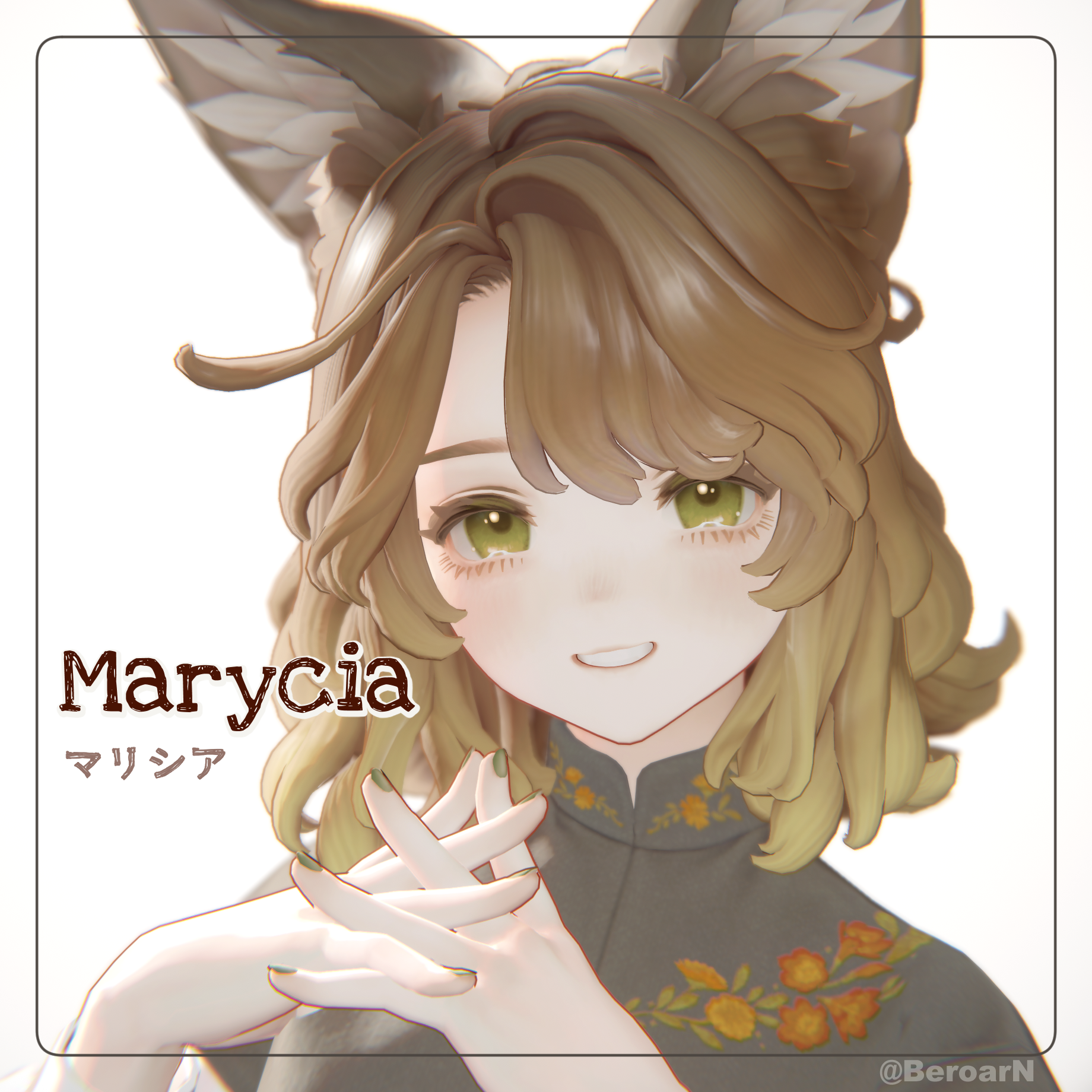 1girl animal_ear_fluff animal_ears artist_name black_dress blonde_hair blush border brn brown_hair character_name chinese_clothes dress eyelashes floral_print fox_ears gradient_hair green_eyes green_nails grin hands_up highres interlocked_fingers looking_at_viewer marycia_(vrchat) medium_hair multicolored_hair nail_polish official_art own_hands_together portrait simple_background smile solo twitter_username unity_(medium) vrchat white_background