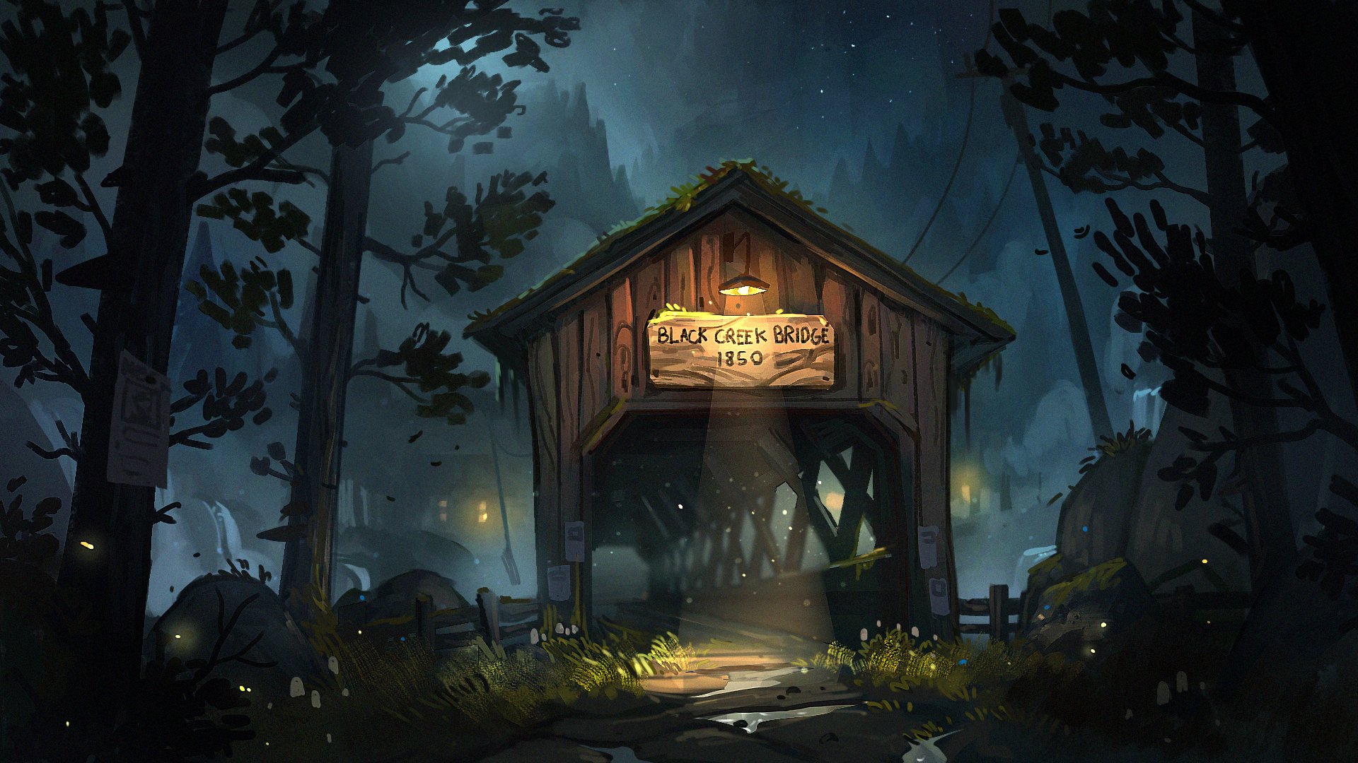 artist_logo bridge building commentary english_commentary fence foliage forest grass highres leaf light_particles logo moss mountainous_horizon nature night no_humans original outdoors overgrown plant power_lines puddle road rock scenery sky tree utility_pole wall_lamp waltjan water waterfall wooden_bridge
