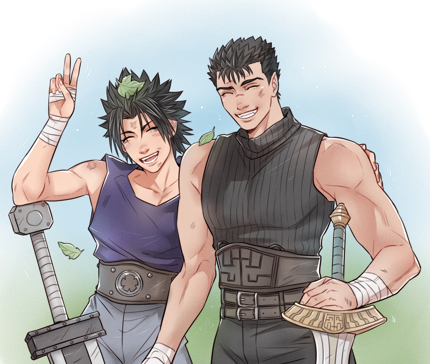 2boys arm_around_shoulder bandaged_hand bandaged_wrist bandages bare_shoulders belt berserk black_pants black_shirt blue_shirt brown_belt closed_eyes cosplay costume_switch crisis_core:_final_fantasy_vii crylin6 dirty dirty_face final_fantasy final_fantasy_vii grey_pants grin guts_(berserk) guts_(berserk)_(cosplay) highres holding holding_sword holding_weapon leaf leaf_on_head male_focus multiple_belts multiple_boys muscular muscular_male open_mouth pants parted_bangs parted_lips scar scar_on_arm shirt short_hair sleeveless sleeveless_shirt smile sword teeth upper_body v weapon zack_fair zack_fair_(cosplay)