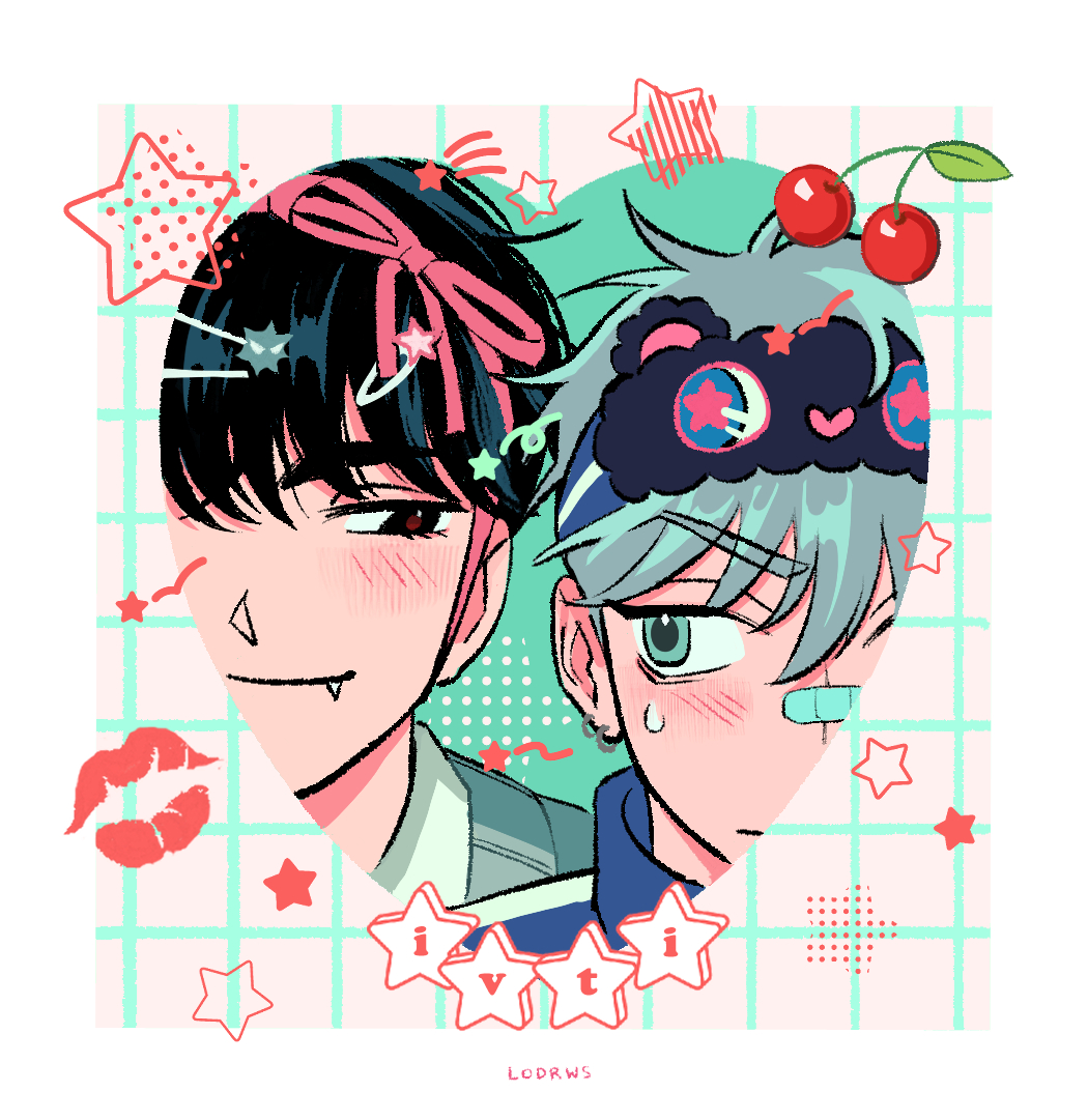 2boys alien_stage bandaid bandaid_on_face bandaid_on_nose black_eyes black_hair blush cherry commentary english_commentary fang fang_out food fruit green_eyes grey_hair hair_ribbon ivan_(alien_stage) lipstick_mark lodrws looking_at_another looking_to_the_side male_focus multiple_boys official_alternate_costume pink_ribbon red_pupils ribbon pairing_name signature star_(symbol) sweatdrop till_(alien_stage)