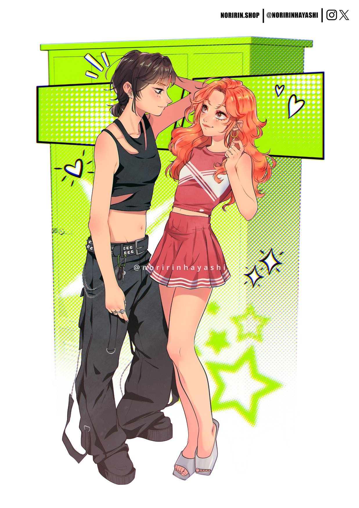 2girls belt black_belt black_eyes black_hair black_nails black_pants black_shoes black_tank_top carabiner chain cheerleader commentary earrings green_background hand_on_own_head heart highres hoop_earrings jewelry key kininatteru_hito_ga_otoko_ja_nakatta koga_mitsuki locker long_hair midriff mole mole_under_eye multiple_girls multiple_rings navel noririnhayashi oosawa_aya pants pink_eyes pink_hair red_shirt red_skirt ring shirt shoes short_hair skirt sleeveless sleeveless_shirt star_(symbol) studded_belt tank_top white_shoes yuri
