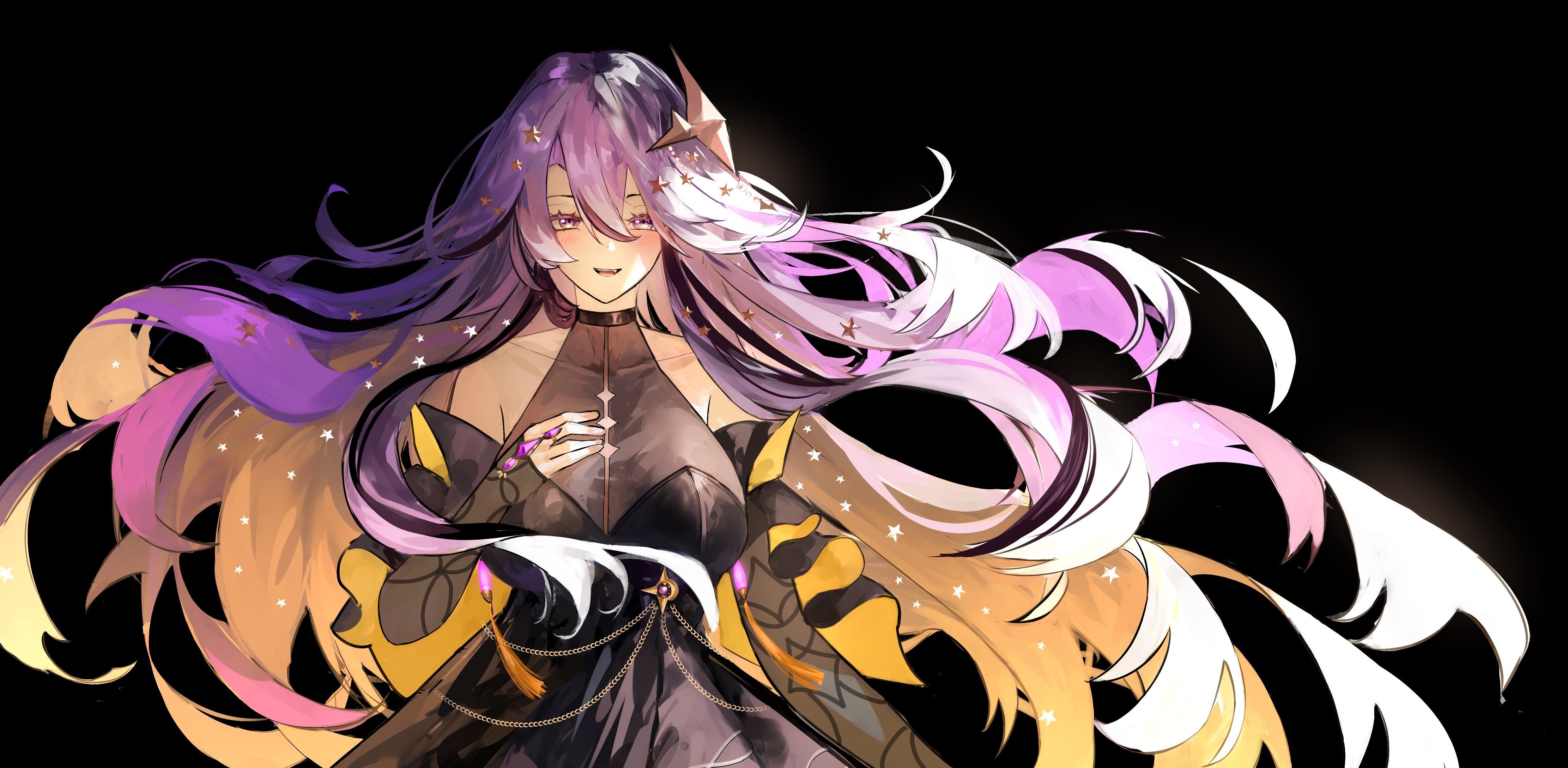 absurdres black_background breasts clothing_cutout colored_inner_hair commentary dress english_commentary fang hair_ornament halter_dress halterneck highres hololive hololive_indonesia large_breasts lewdlily66 moona_hoshinova moona_hoshinova_(goddess) multicolored_hair official_art open_mouth purple_hair shoulder_cutout simple_background smile star_(symbol) star_hair_ornament starry_hair streaked_hair two-tone_dress upper_body virtual_youtuber