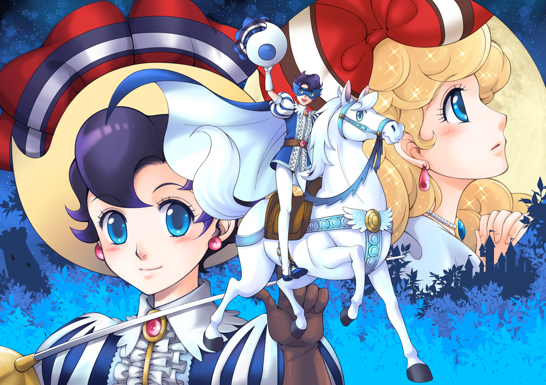 1girl arm_up black_hair blonde_hair blue_cape blue_eyes blue_shoes brown_gloves cape closed_mouth commentary_request earrings eye_mask eyelashes gloves highres holding horseback_riding jewelry long_hair mask misuzu_aki multiple_views own_hands_clasped own_hands_together pantyhose princess_sapphire puff_and_slash_sleeves puffy_sleeves red_shirt ribbon_no_kishi riding shirt shoes short_hair sparkle white_gloves white_horse white_pantyhose