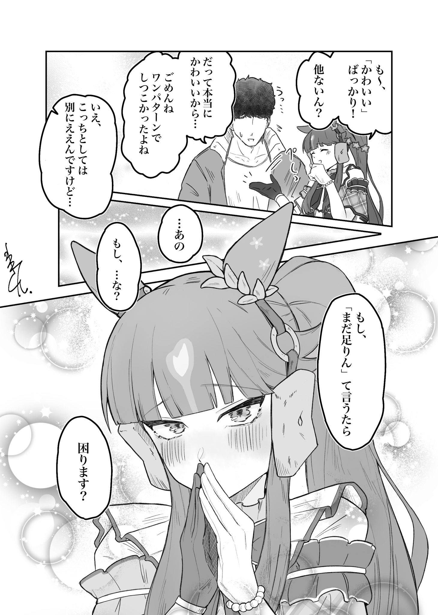 1boy 1girl alternate_costume animal_ears blunt_bangs blush collarbone commentary_request dress faceless faceless_male gloves hair_between_eyes hair_ornament highres hime_cut horse_ears horse_girl horse_tail long_hair looking_at_viewer lucky_lilac_(umamusume) own_hands_clasped own_hands_together portrait side_ponytail tail trainer_(umamusume) translation_request umamusume wakita_otk
