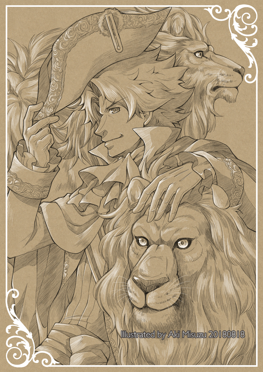 1boy adjusting_clothes adjusting_headwear artist_name ascot border classicaloid closed_mouth gloves hat highres lion looking_at_viewer ludwig_van_beethoven_(classicaloid) male_focus misuzu_aki monochrome sepia short_hair solo tricorne