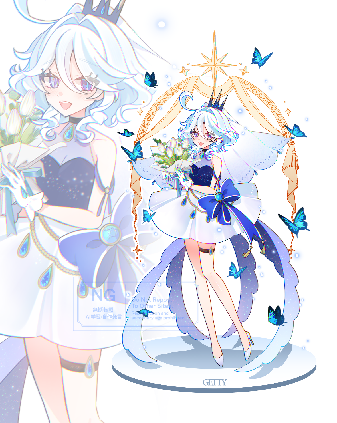 1girl ahoge alternate_costume artist_name bare_shoulders blue_eyes blue_hair bouquet bridal_veil bug butterfly dress drop-shaped_pupils flower furina_(genshin_impact) genshin_impact getty-gy gloves heterochromia highres holding holding_bouquet insect mismatched_pupils multicolored_hair sleeveless sleeveless_dress solo streaked_hair symbol-shaped_pupils thigh_strap tiara veil wedding_dress white_gloves