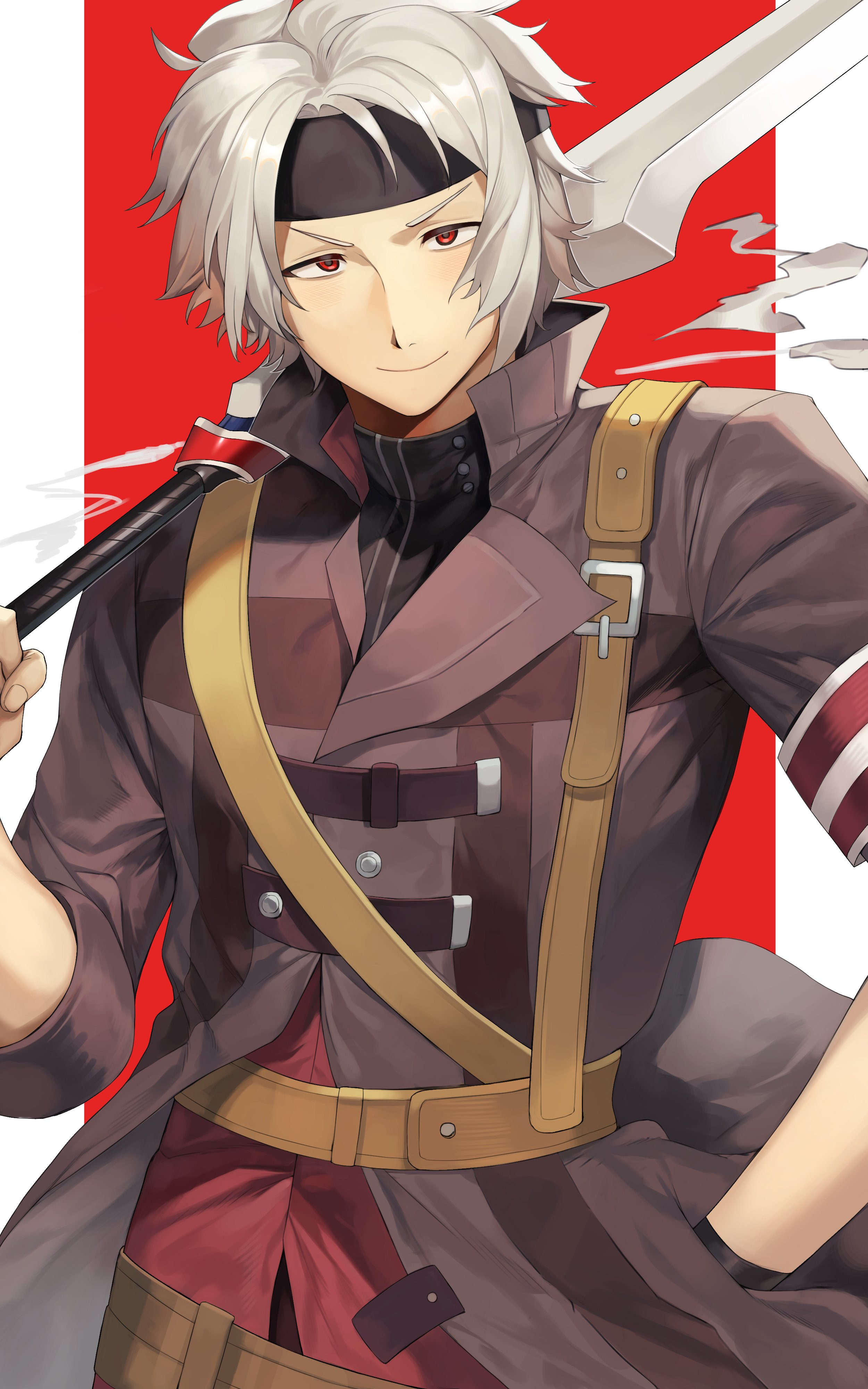 1boy absurdres black_headband brown_coat cancanbaobao55 closed_mouth coat crow_armbrust double_blade eiyuu_densetsu hashtag-only_commentary headband highres holding holding_weapon looking_at_viewer male_focus outside_border pillarboxed red_background red_eyes sen_no_kiseki sen_no_kiseki_(series) sen_no_kiseki_ii short_hair simple_background smile smoke solo standing v-shaped_eyebrows weapon white_hair