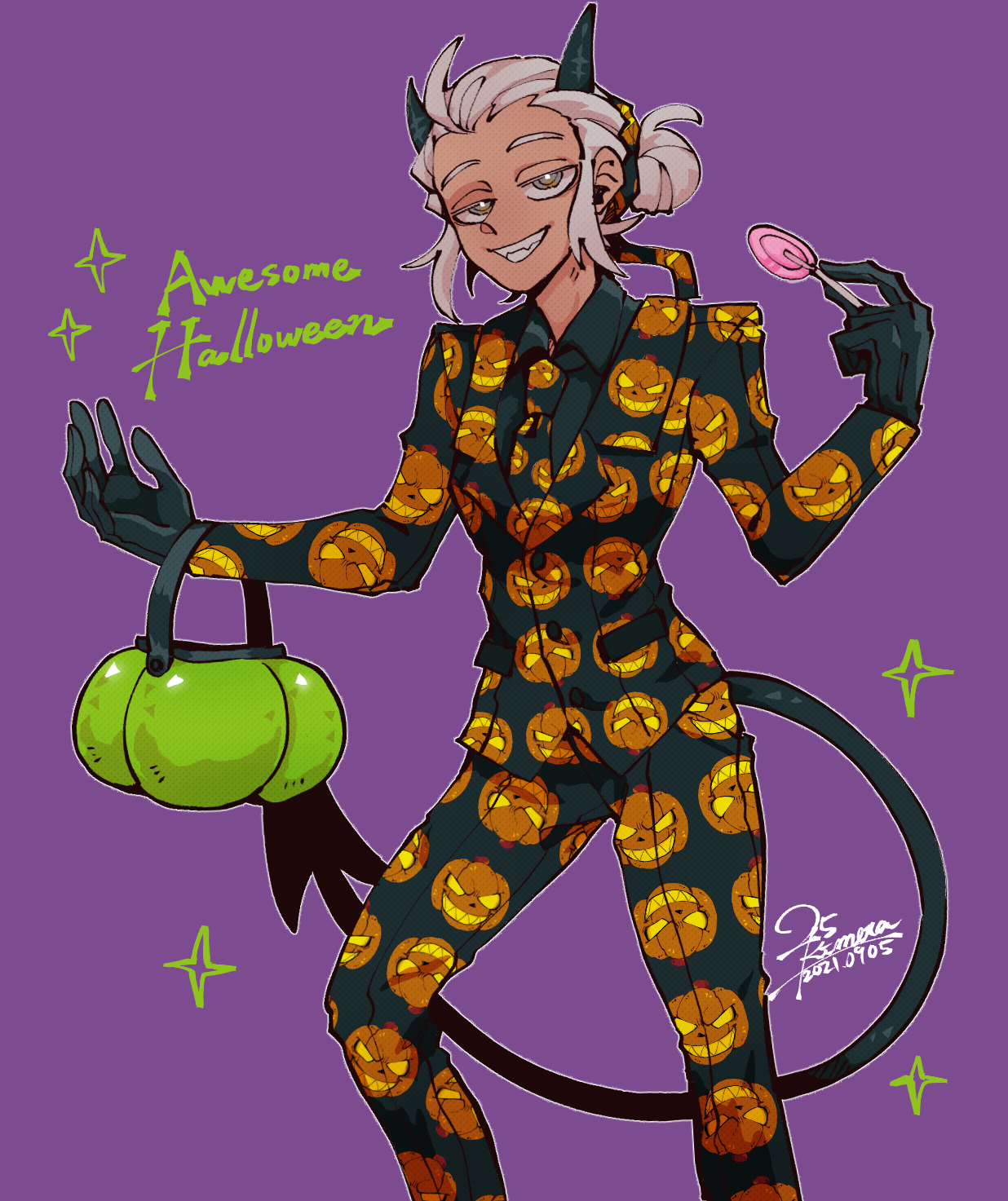 1girl 25_kimera alternate_costume black_gloves black_horns black_jacket black_necktie black_pants black_shirt black_suit blind candy collared_shirt commentary_request dated demon_girl demon_tail english_text food formal_clothes gloves grey_eyes hair_bun halloween halloween_bucket helltaker highres holding holding_candy holding_food holding_lollipop horns jack-o'-lantern_print jacket justice_(helltaker) lollipop necktie no_eyewear outline pants print_jacket print_necktie print_pants purple_background sharp_teeth shirt signature smile solo sparkle standing suit tail teeth white_hair white_outline