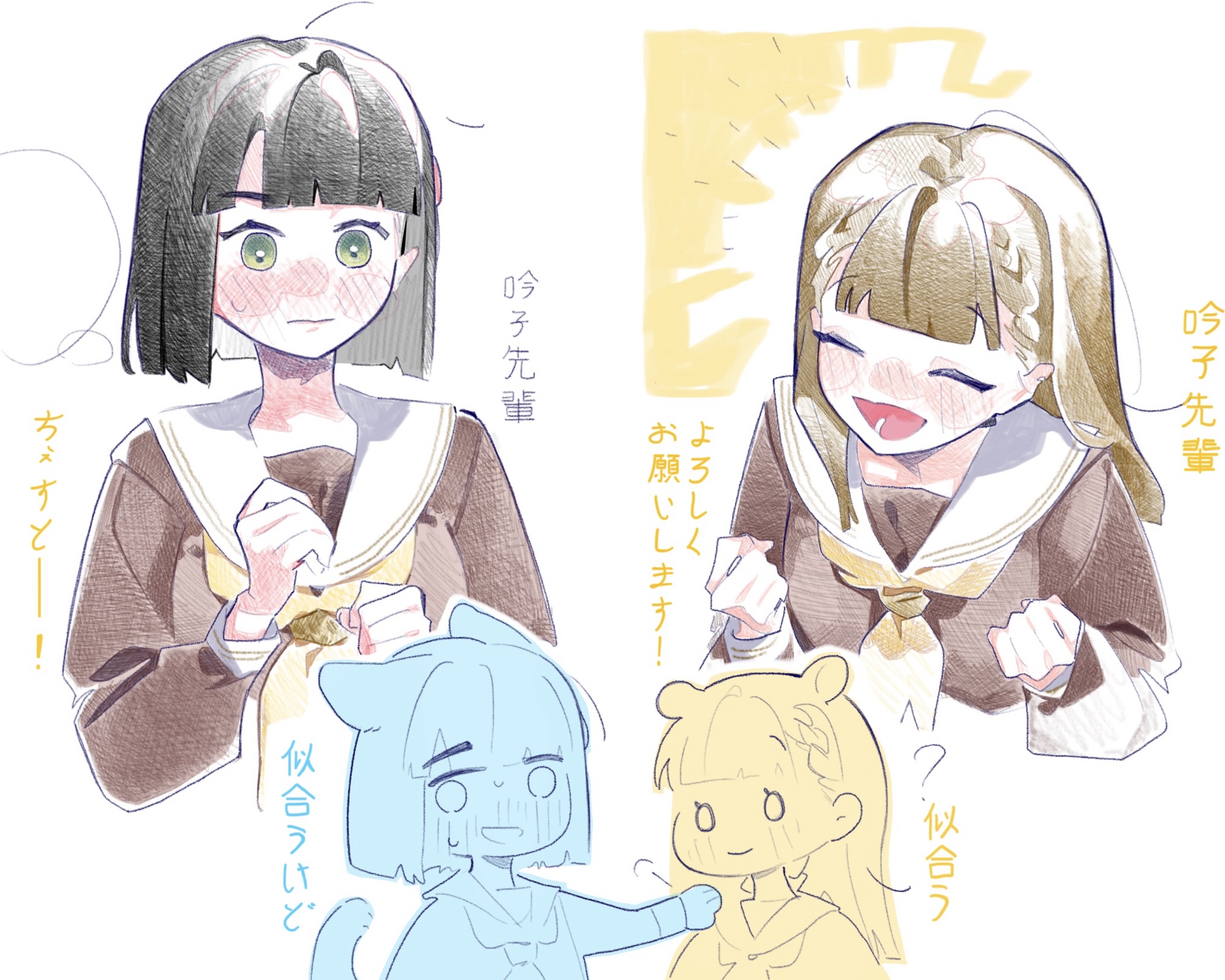 2girls animal_ears black_hair blunt_bangs blunt_ends blush braid brown_dress brown_hair cat_ears center-flap_bangs chesto_(phrase) clenched_hands commentary dress flustered green_eyes hand_on_another's_shoulder happy_aura hasu_no_sora_school_uniform highres kachimachi_kosuzu kemonomimi_mode link!_like!_love_live! long_hair long_sleeves love_live! momose_ginko multiple_girls multiple_views neckerchief nose_blush partially_translated pipi_(m1x_mix) sailor_collar sailor_dress school_uniform short_hair side_braids translation_request virtual_youtuber white_sailor_collar winter_uniform yellow_neckerchief