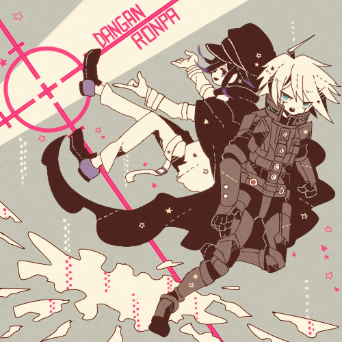 2boys ahoge android arm_belt back-to-back belt belt_buckle black_cape black_hair black_hat black_shoes blue_eyes buckle cape clenched_hand collared_cape colored_skin colored_tips copyright_name crosshair danganronpa_(series) danganronpa_v3:_killing_harmony dot_nose dotted_line floating frown full_body grey_background hair_between_eyes halftone hat high_collar jacket k1-b0 layered_sleeves looking_at_viewer lowres male_focus multicolored_hair multicolored_shoes multiple_belts multiple_boys oma_kokichi open_belt open_mouth outstretched_hand pants peaked_cap purple_eyes purple_hair purple_shoes shoes short_hair smile star_(symbol) swept_bangs teeth thigh_belt thigh_strap torn_clothes torn_jacket toskogahazan two-tone_shoes upper_teeth_only v-shaped_eyes white_belt white_hair white_jacket white_pants white_skin wrist_belt