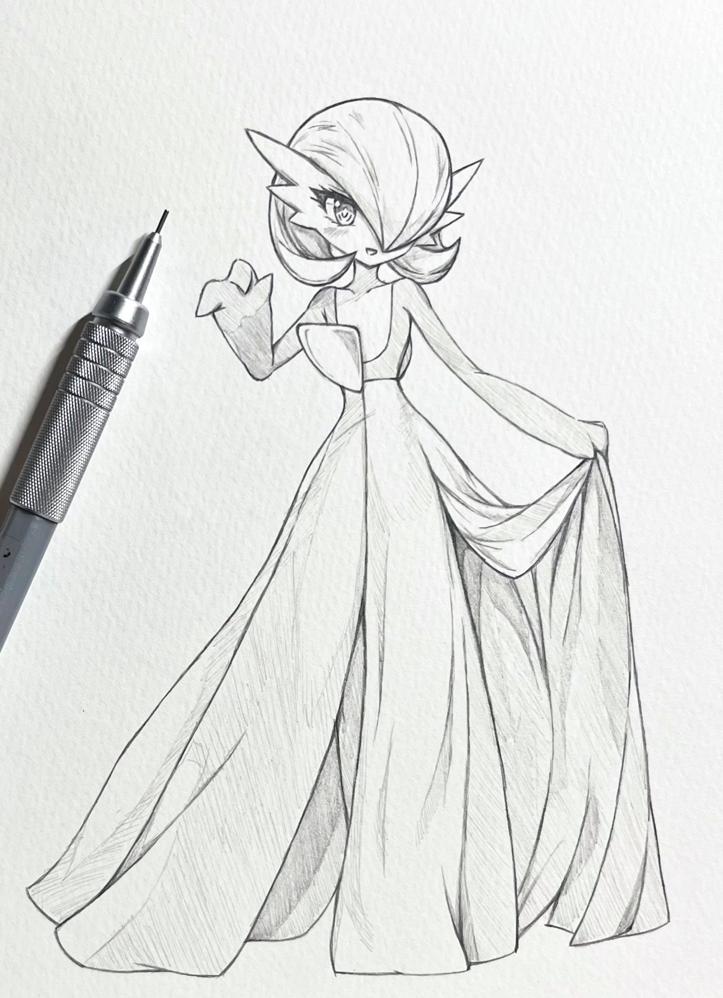 1girl art_tools_in_frame clothes_lift commentary_request dress dress_lift eyelashes full_body gardevoir gen_3_pokemon greyscale hair_over_one_eye highres medium_hair monochrome nintendo photo_(medium) pokemon pokemon_(creature) seishun_dendeke smile solo traditional_media