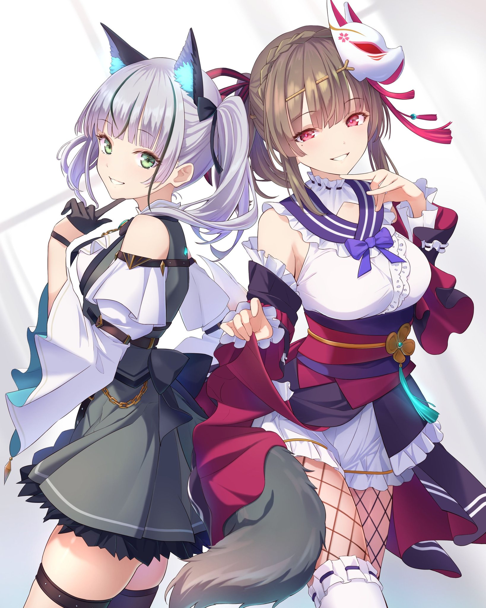 2girls animal_ear_fluff animal_ears blunt_bangs bow braid breasts brown_hair crown_braid detached_sleeves fishnets fox_mask frills green_eyes hair_ornament hair_stick heaven_burns_red highres holding_own_dress japanese_clothes kiryuu_miya lolita_fashion long_hair mask mask_on_head mole mole_under_eye multicolored_hair multiple_girls netarou_(shinra) official_alternate_costume red_eyes skirt streaked_hair sugawara_chie sugawara_chie_(feral_insanity) tail twintails wa_lolita white_hair wide_sleeves wolf_ears wolf_girl wolf_tail