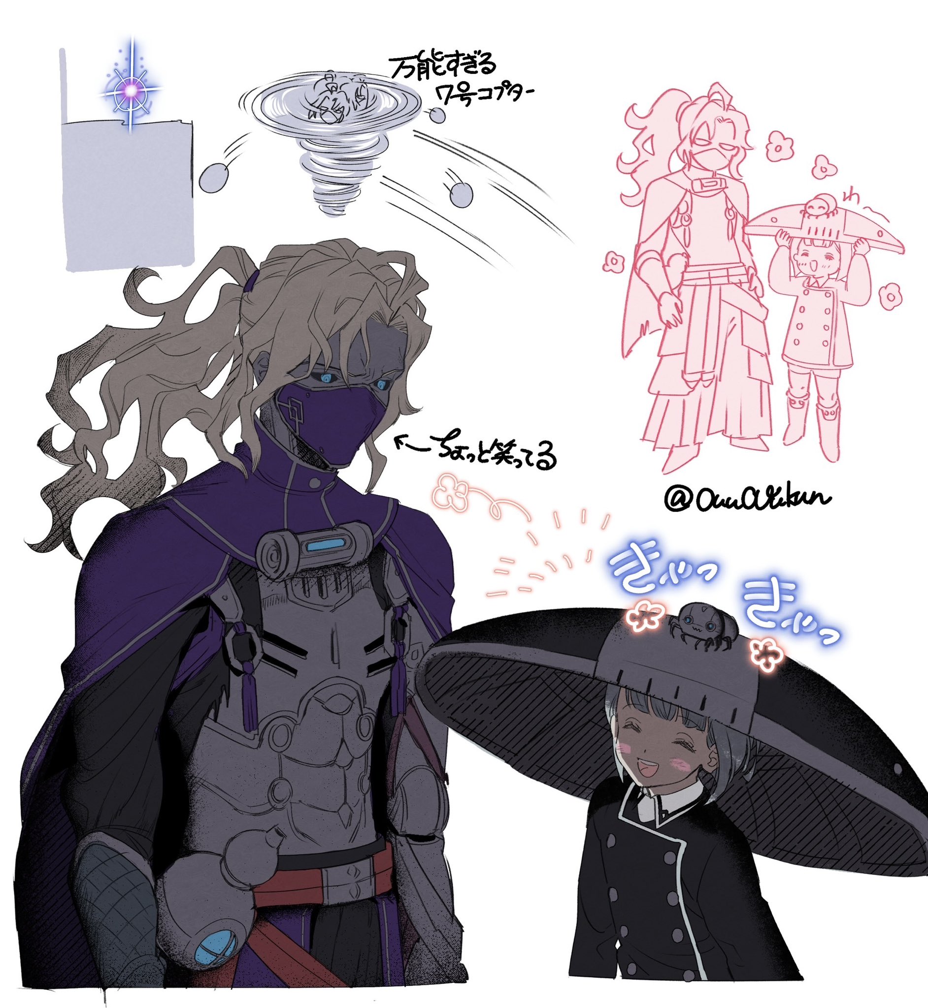 1boy 1girl black_sclera blonde_hair blue_eyes blush_stickers bug cloak closed_eyes colored_sclera ender_lilies_quietus_of_the_knights ender_magnolia_bloom_in_the_mist grey_hair hat highres lilac_(ender_magnolia) mask motley_(ender_magnolia) no.7_(ender_magnolia) open_mouth ponytail samurai short_hair sketch smile spider translation_request wide_brim yunosuke_(ouuouukun)
