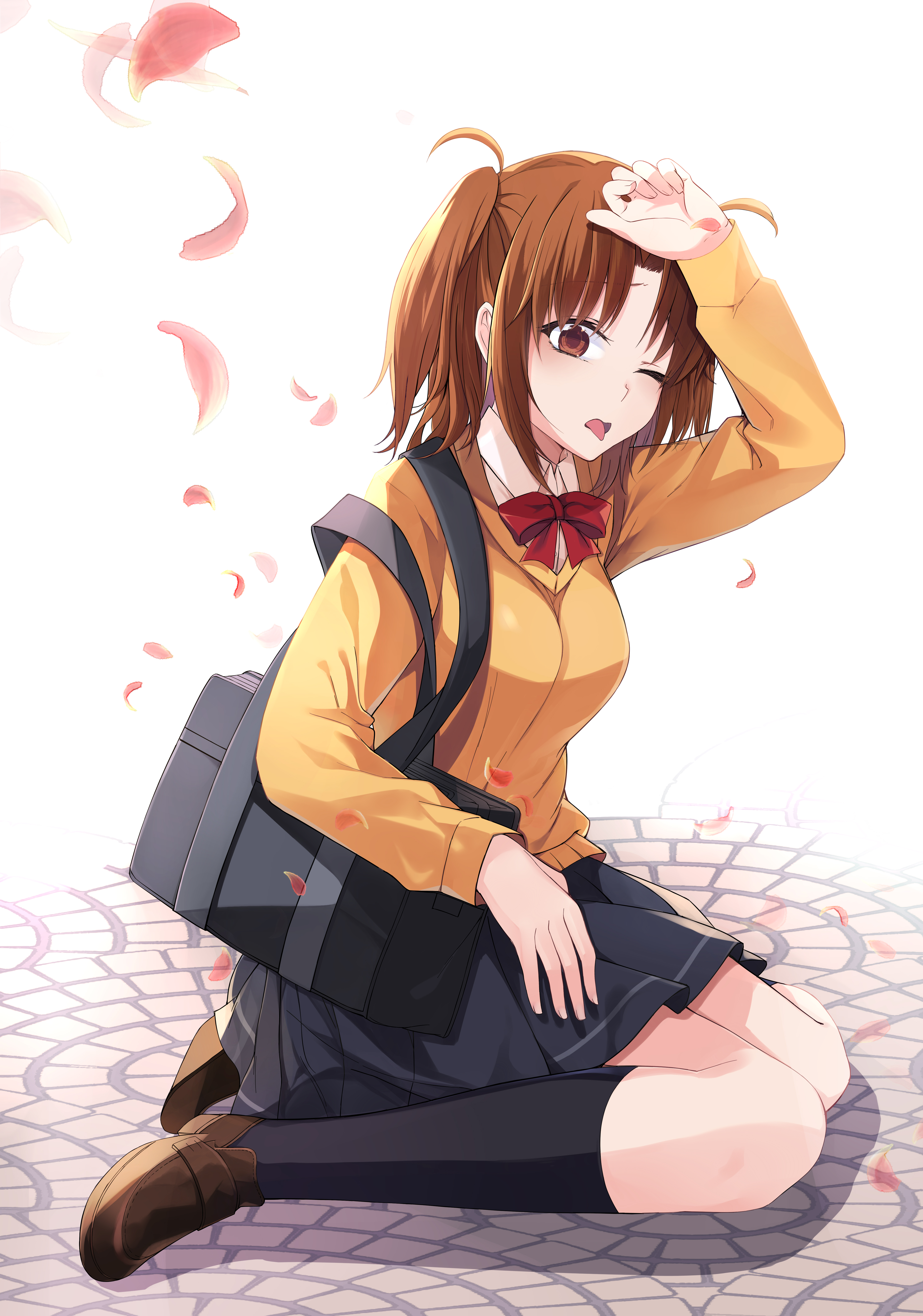 1girl absurdres antenna_hair bag black_bag black_skirt black_socks bow bowtie brown_eyes brown_hair brown_shoes cardigan collared_shirt commentary_request highres kneeling long_sleeves one_eye_closed parted_bangs petals pleated_skirt red_bow red_bowtie school_bag school_uniform shirt shoes skirt socks solo tongue tongue_out tsukihime tsukihime_(remake) two_side_up watorabi white_shirt yellow_cardigan yumizuka_satsuki