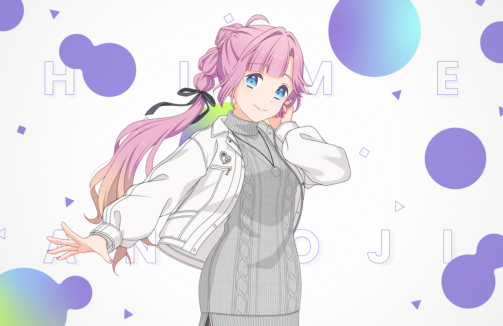 1girl abstract_background ahoge anyoji_hime anyoji_hime_(winter_casual) arm_up black_pantyhose blonde_hair blue_eyes blunt_bangs breasts character_name closed_mouth collared_jacket cowboy_shot dress game_cg grey_dress grey_sweater hair_intakes highres jacket jewelry link!_like!_love_live! long_sleeves looking_at_viewer love_live! medium_breasts multi-tied_hair necklace non-web_source official_alternate_costume official_art open_clothes open_hand open_jacket outstretched_arm pantyhose pink_hair pink_nails ponytail puffy_long_sleeves puffy_sleeves self-datamine sidelocks smile solo split_mouth sweater sweater_dress swept_bangs virtual_youtuber white_background white_jacket